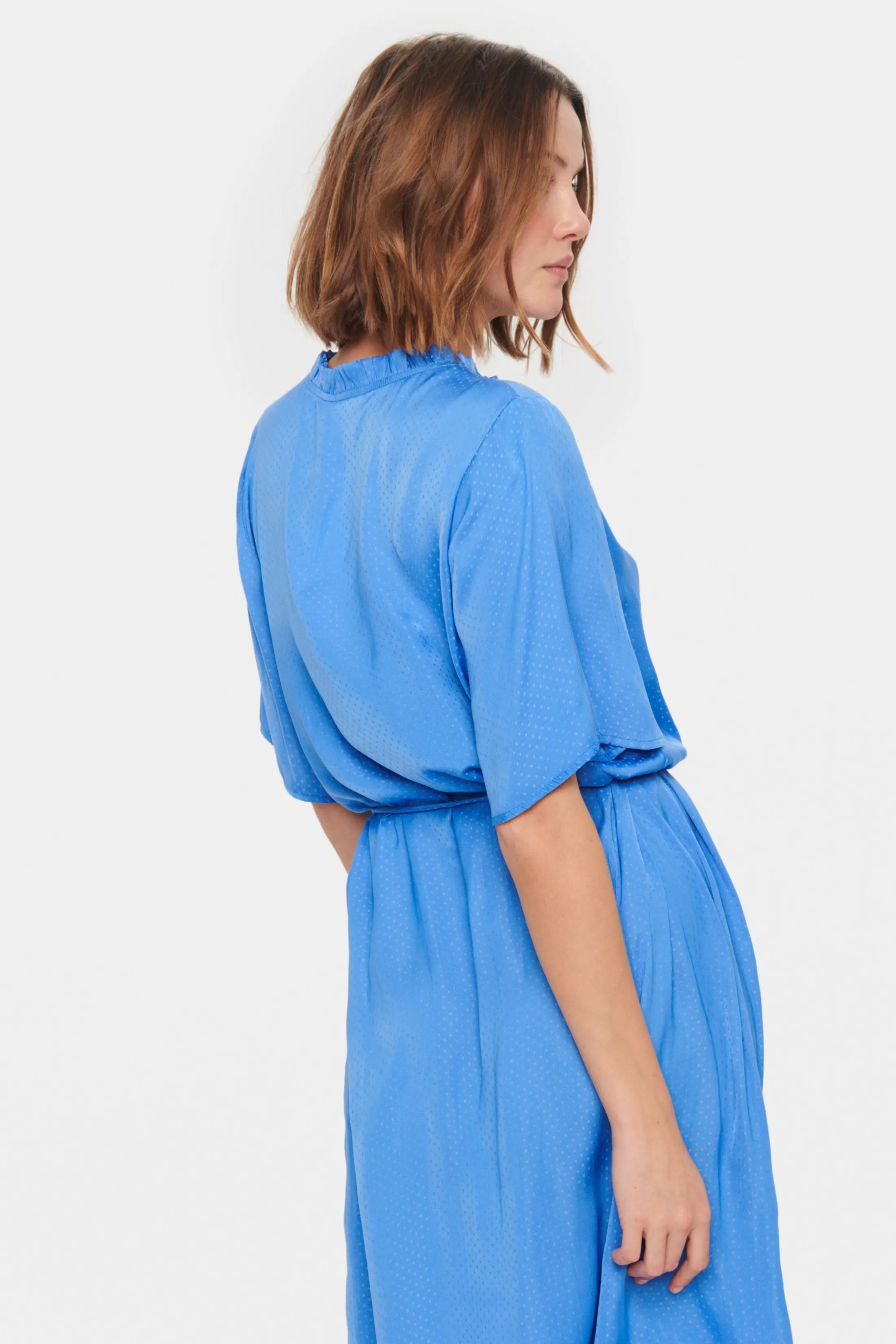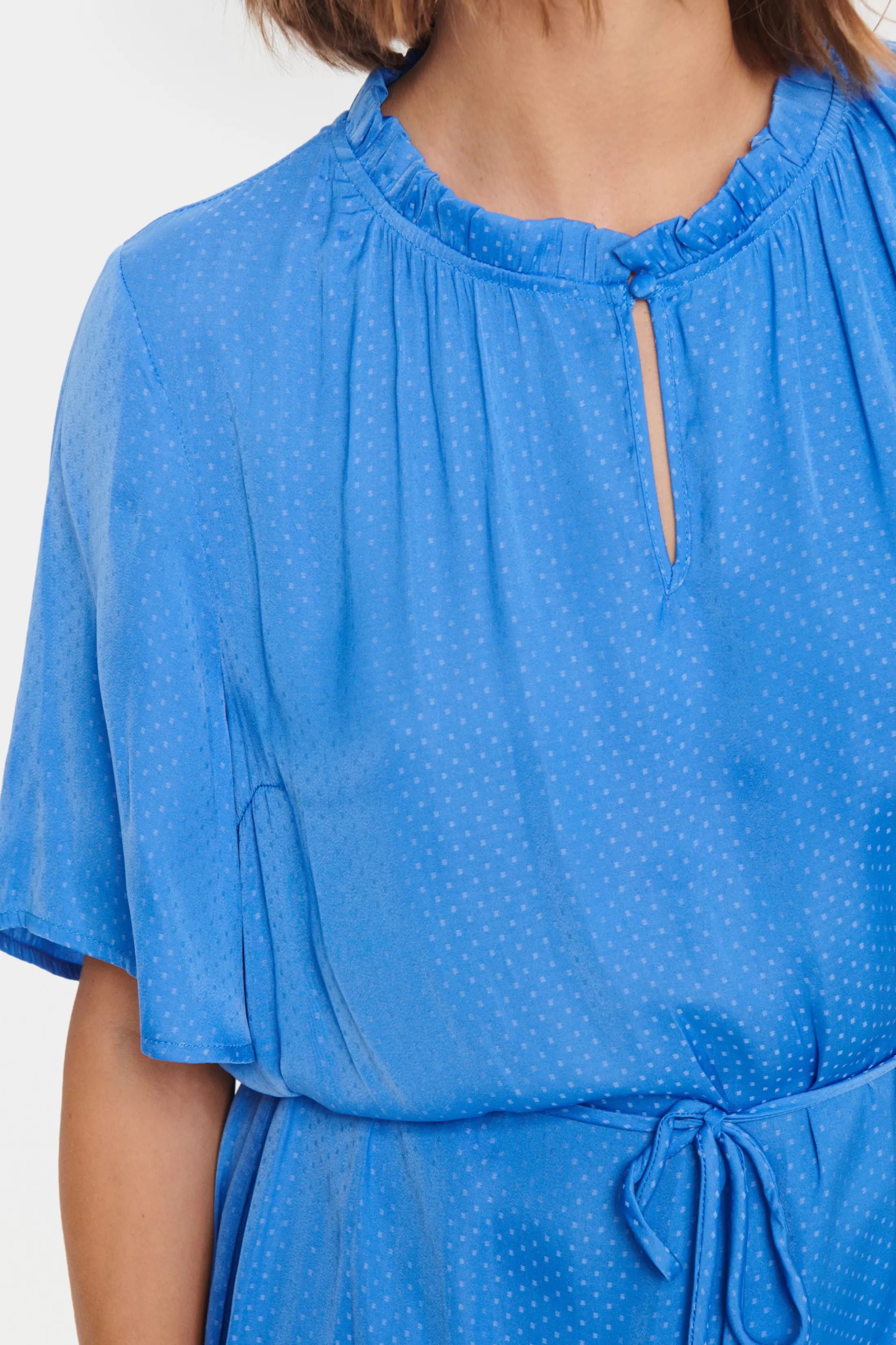 Kjole med brede ærmer, kinakrave med flæser, bindebånd i tajlen samt en knaplukning ved halsen. nnModellen er 175 cm høj og er iført en størrelse M.