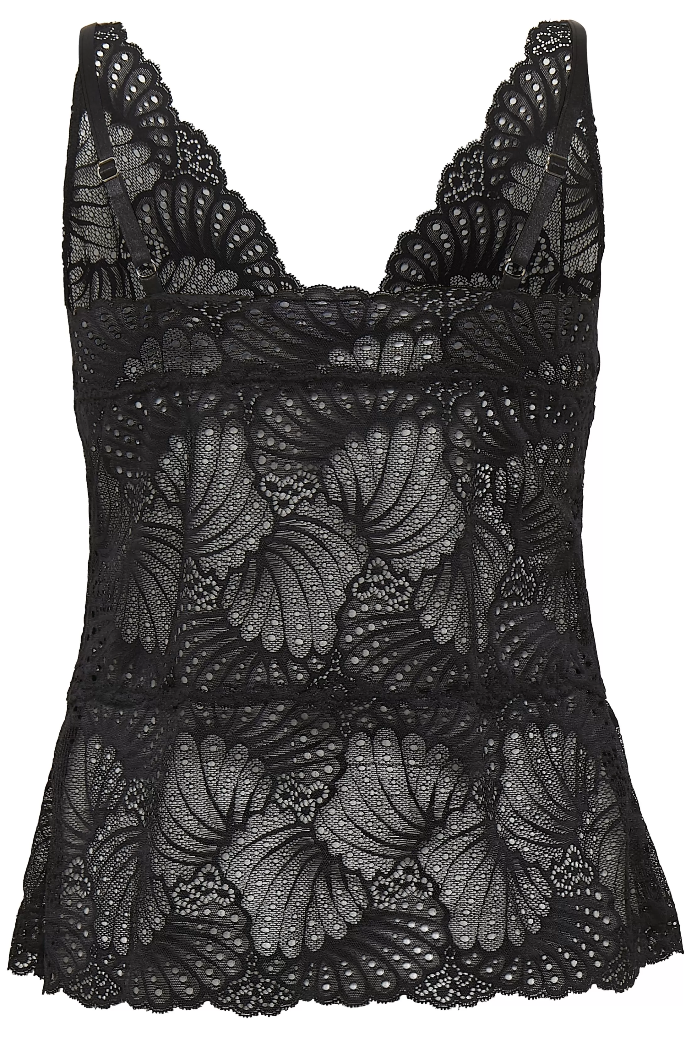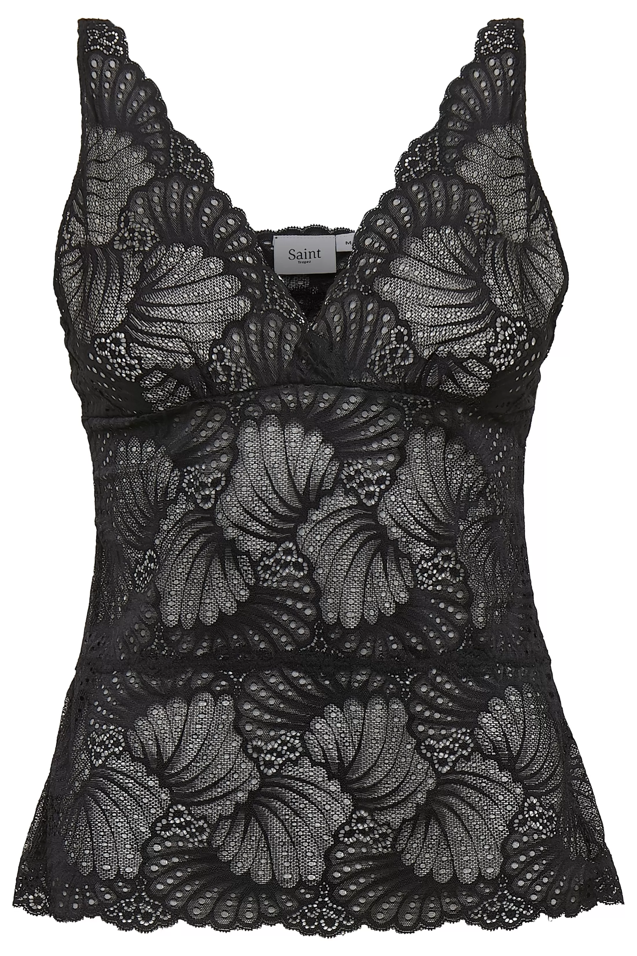 Denne delikate mintfarvede blondetop har et blomsterdesign og en flatterende V-udskæring. Den tætsiddende silhuet og den bølgede kant skaber et elegant og feminint look, perfekt til lag-på-lag eller alene.