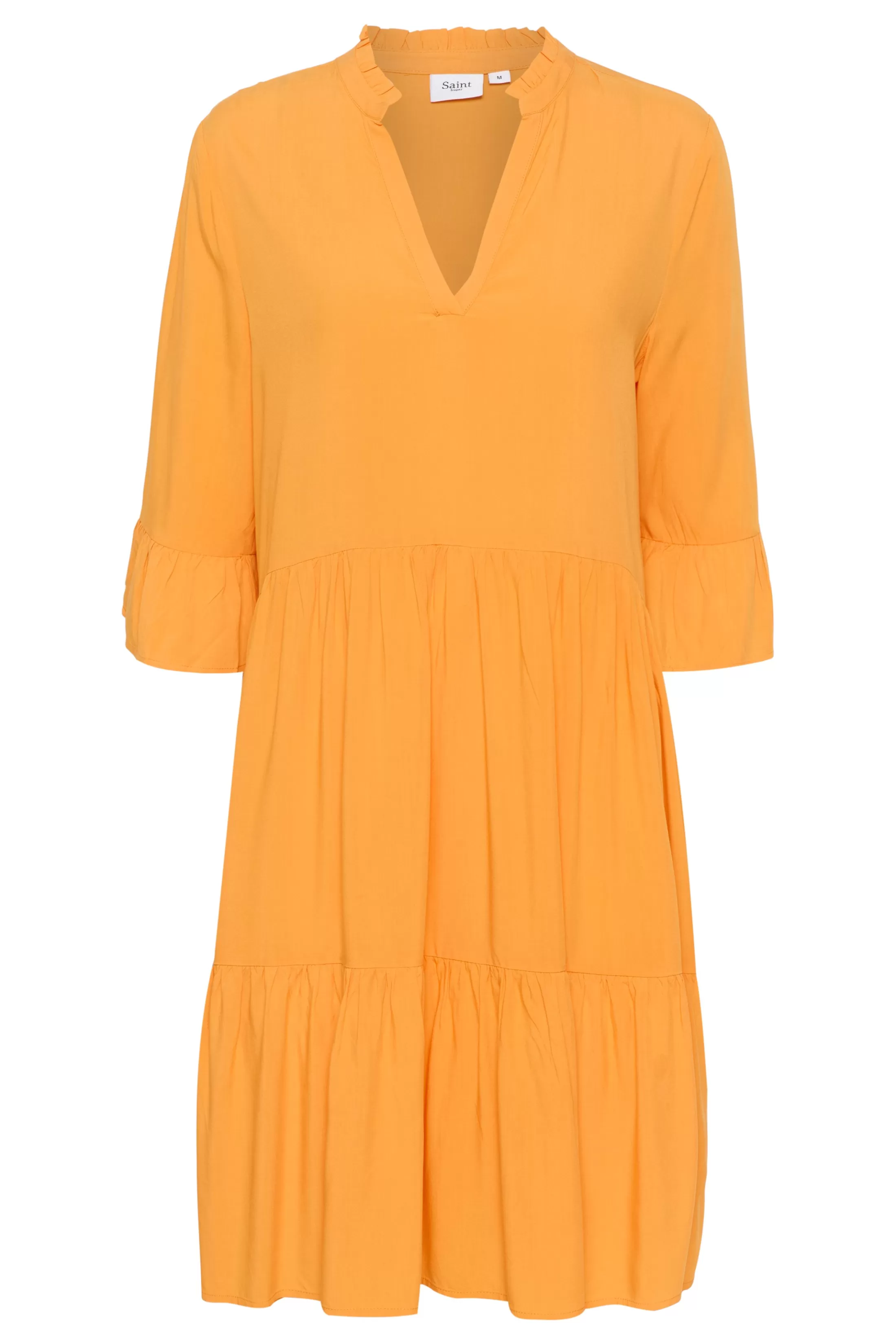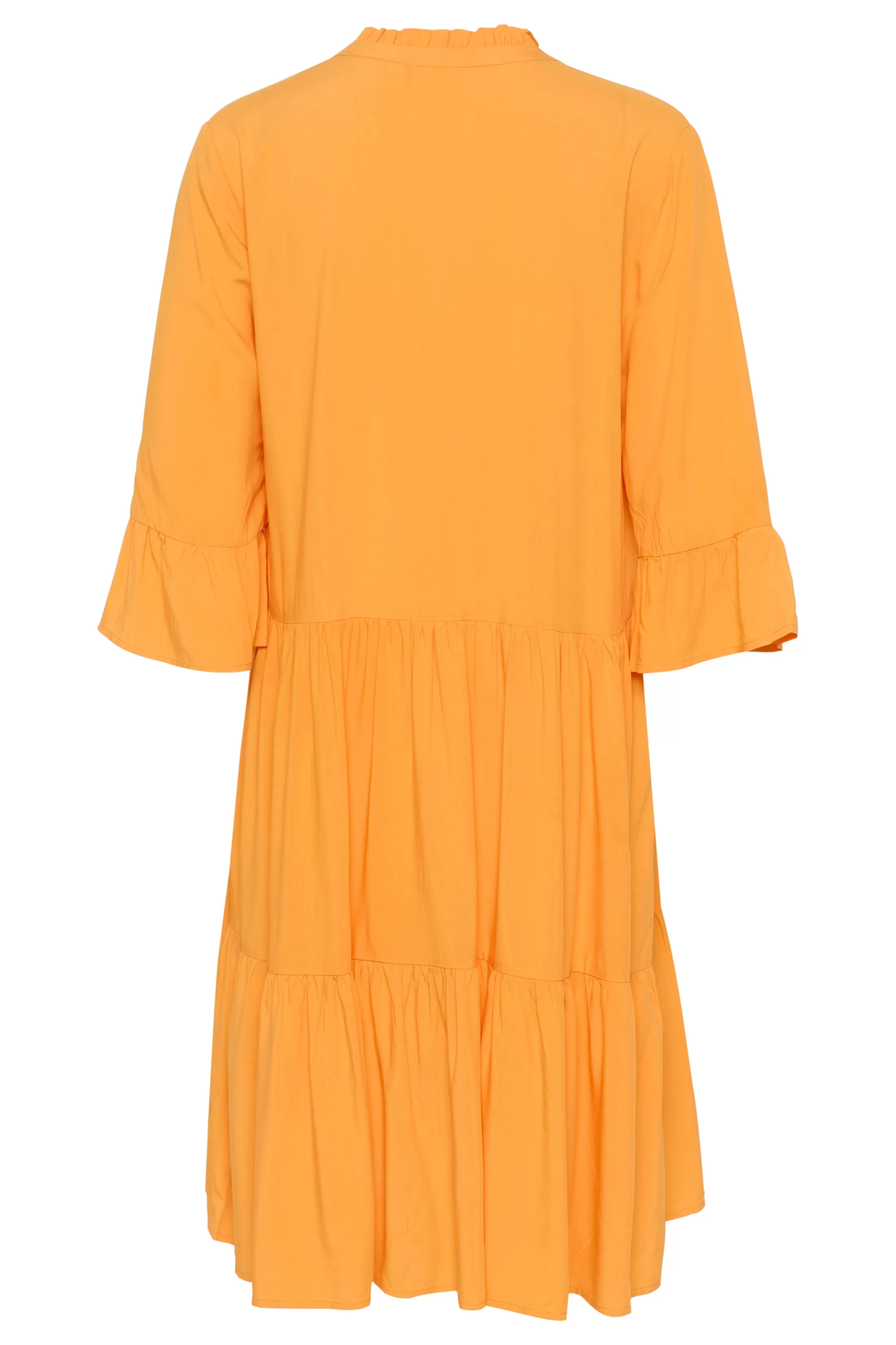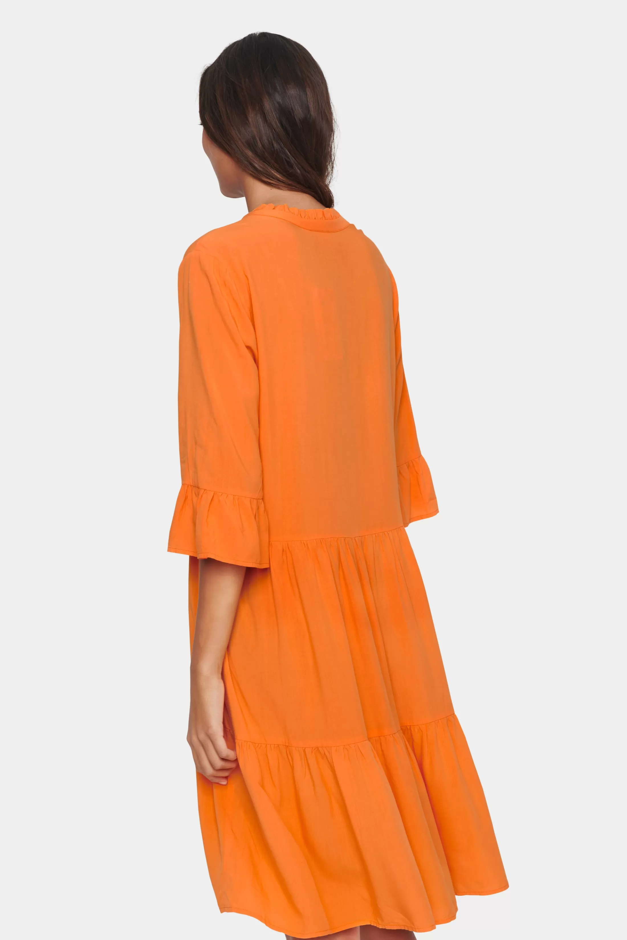 Mønstret kjole med V-hals, 3/4-ærmer med overskæring samt overskæring i taljen og forneden. Kjolen har en løstsiddende pasform og har en let vævet kvalitet.