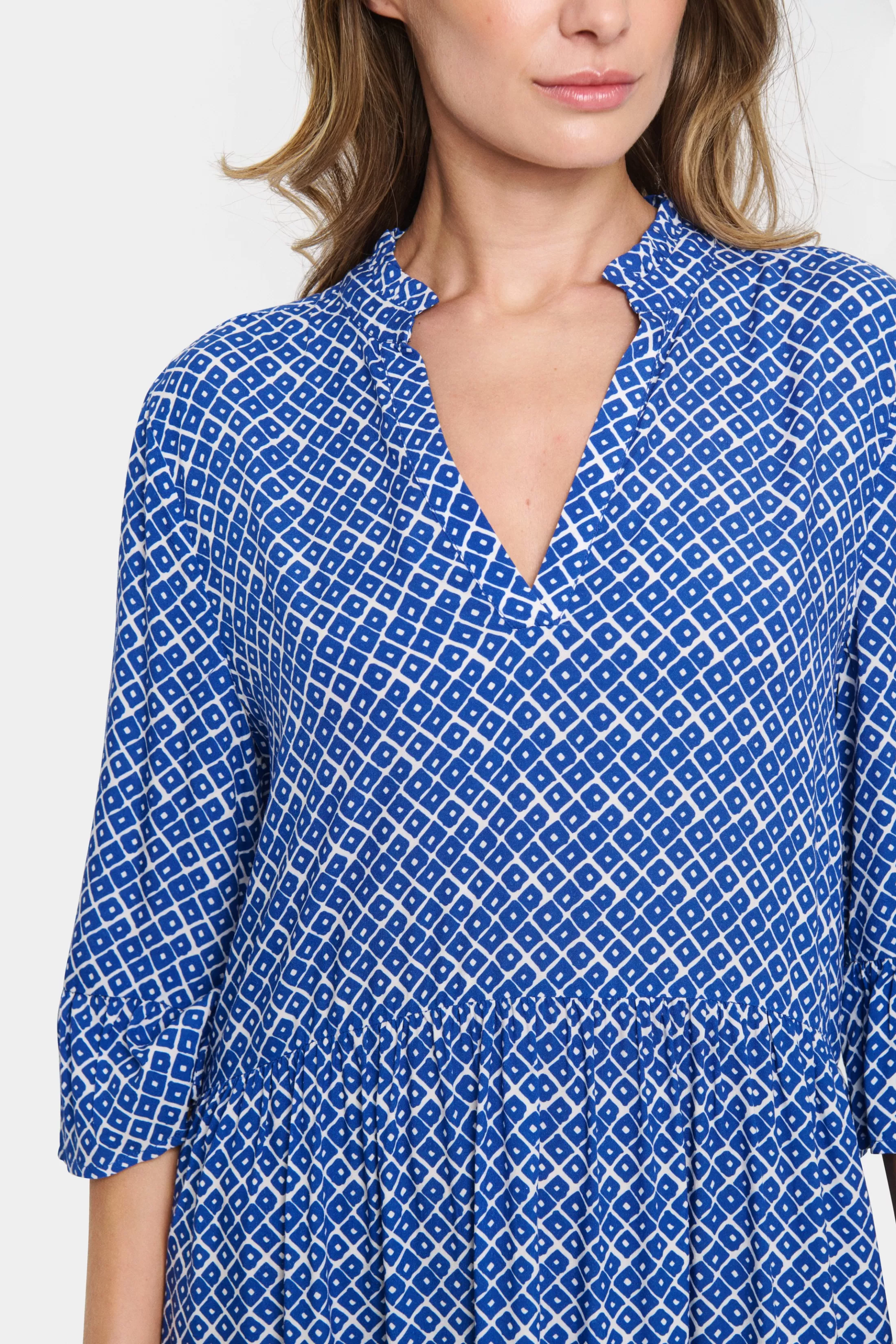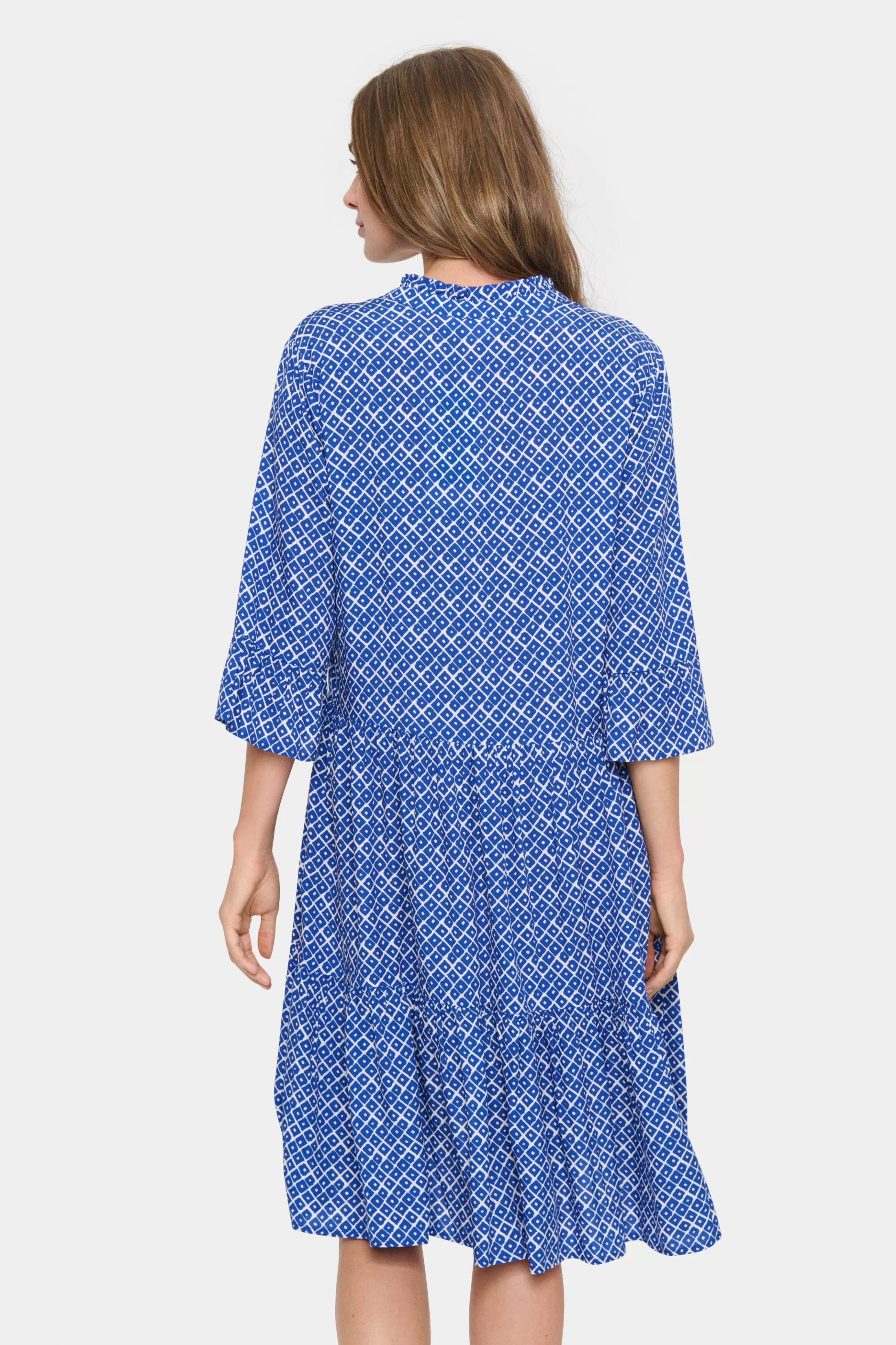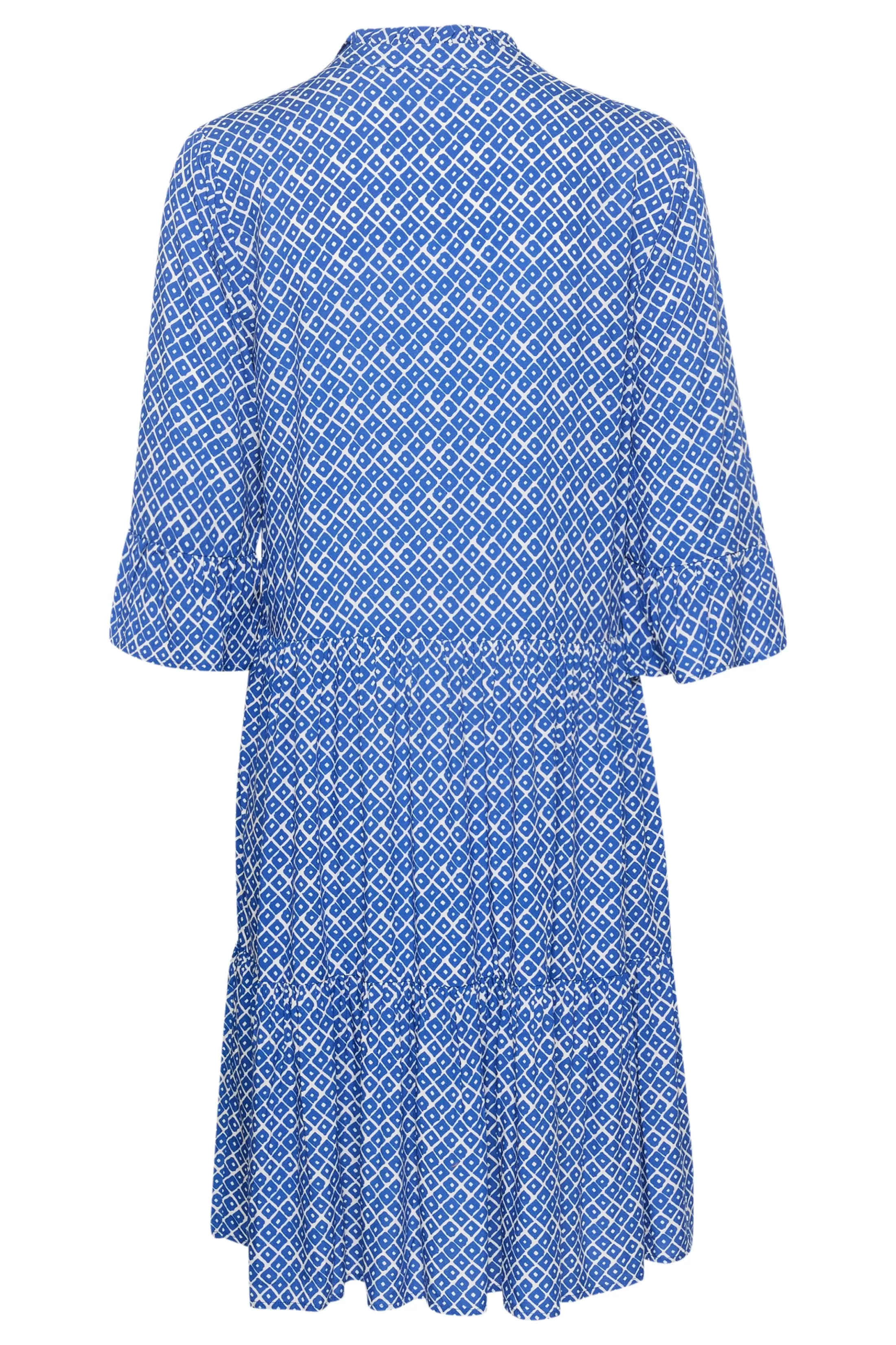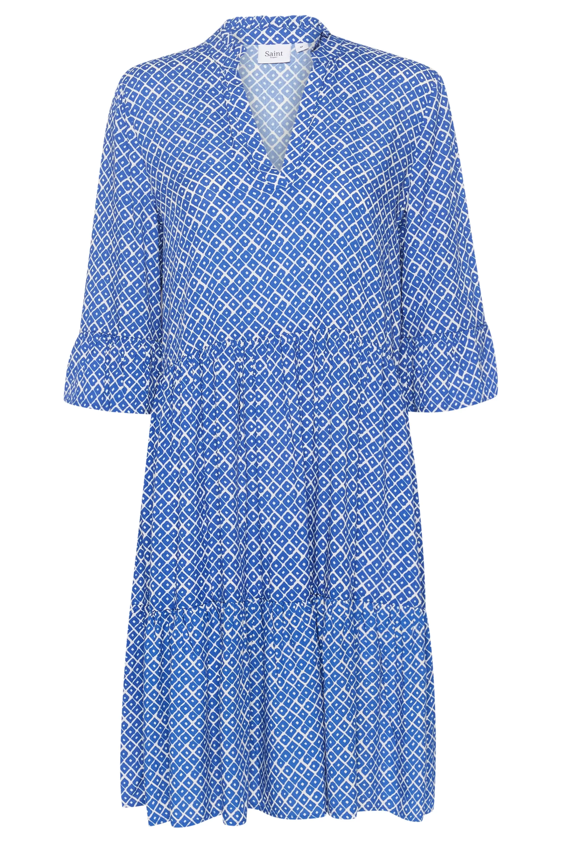 Mønstret kjole med V-hals, 3/4-ærmer med overskæring samt overskæring i taljen og forneden. Kjolen har en løstsiddende pasform og har en let vævet kvalitet.