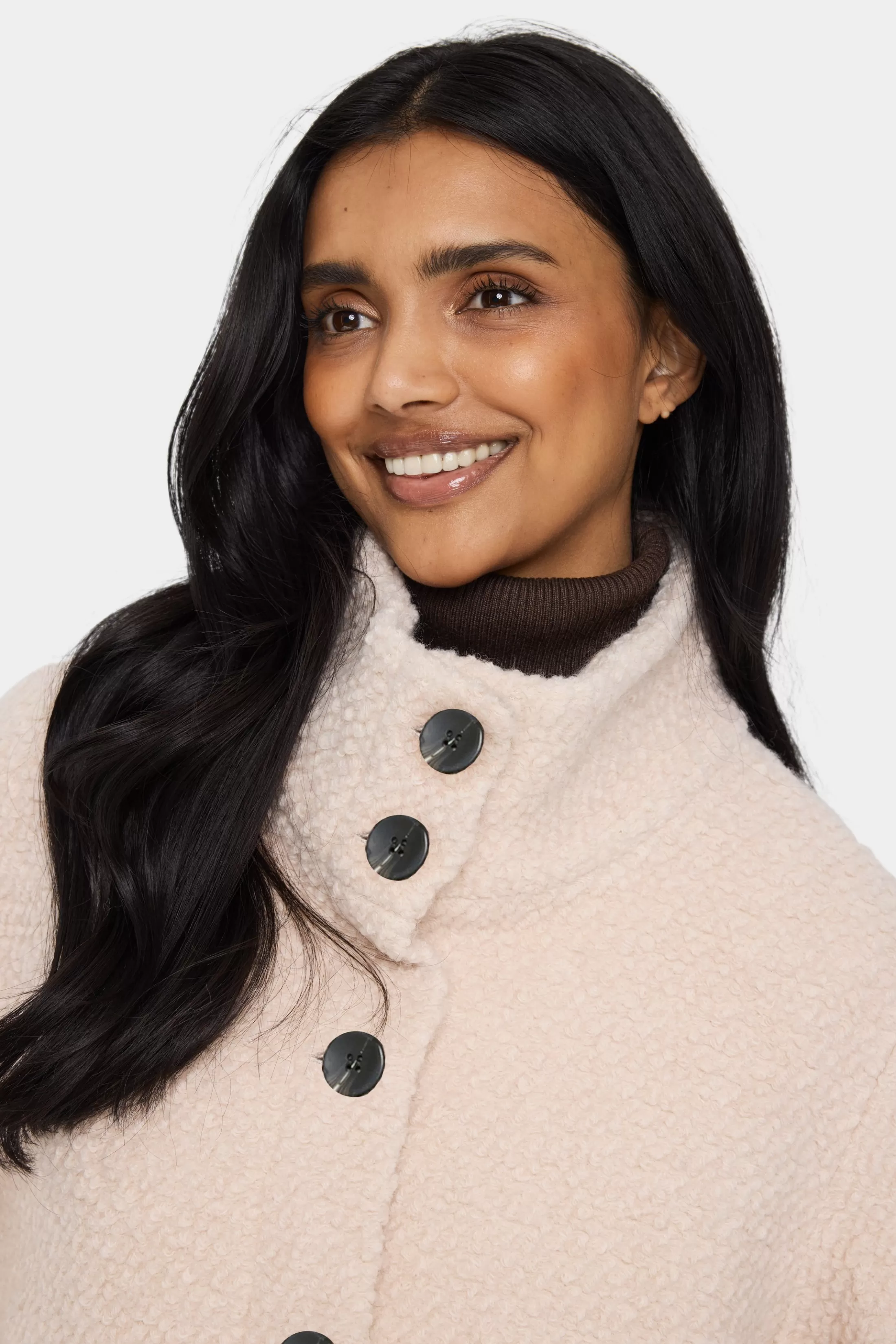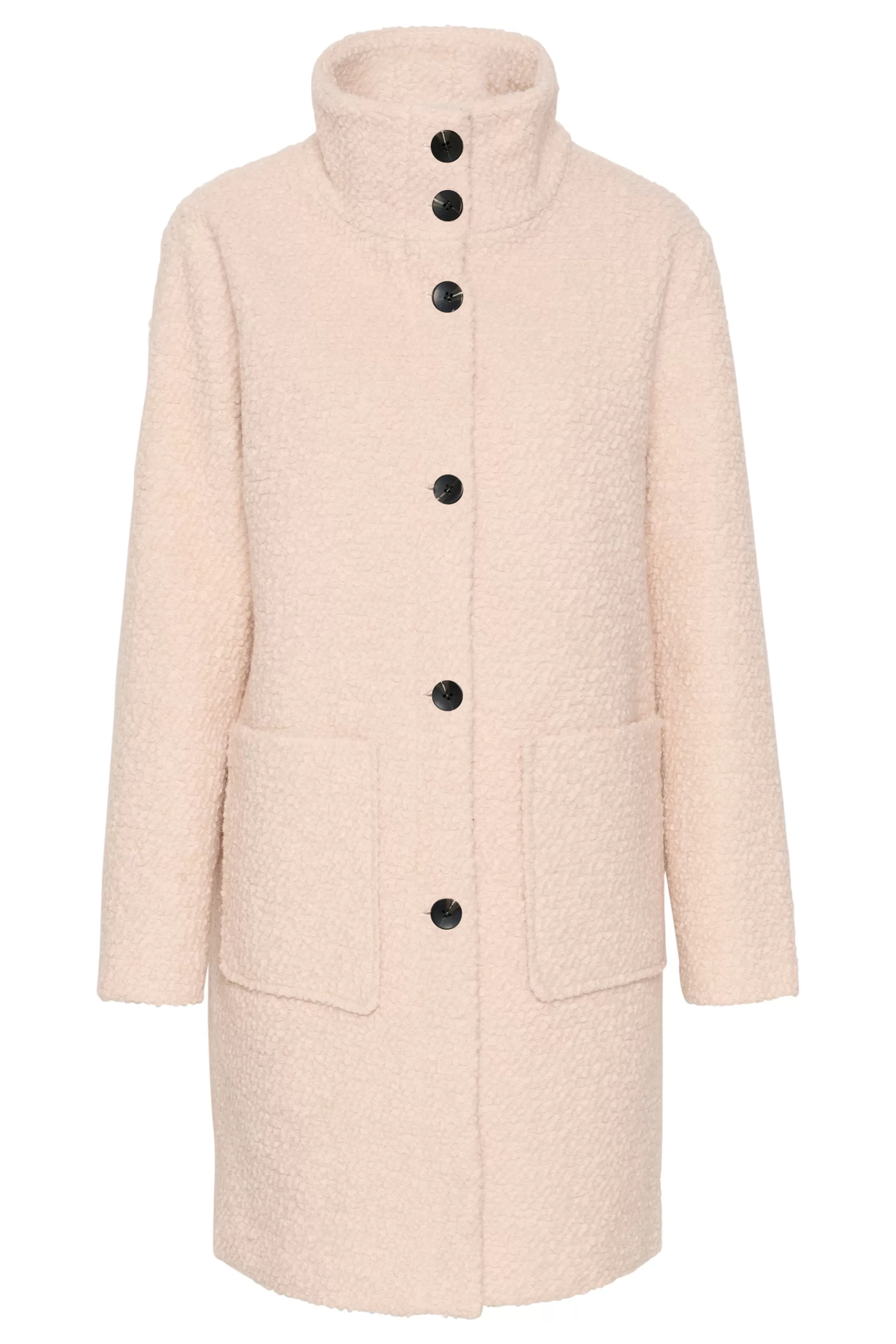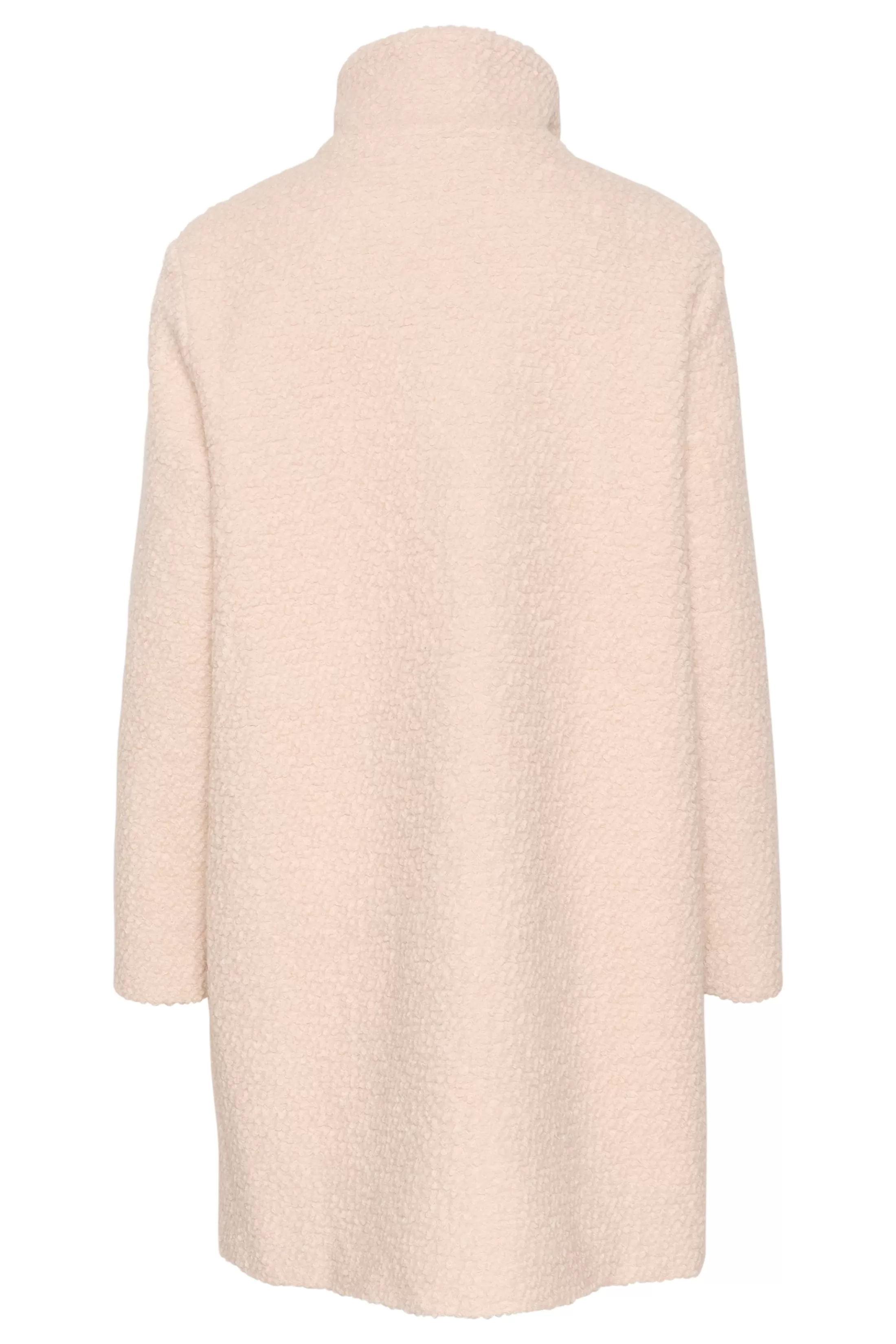 Denne hyggelige, cremefarvede frakke har en elegant, høj halsudskæring og en blød, tekstureret finish. Dens minimalis…