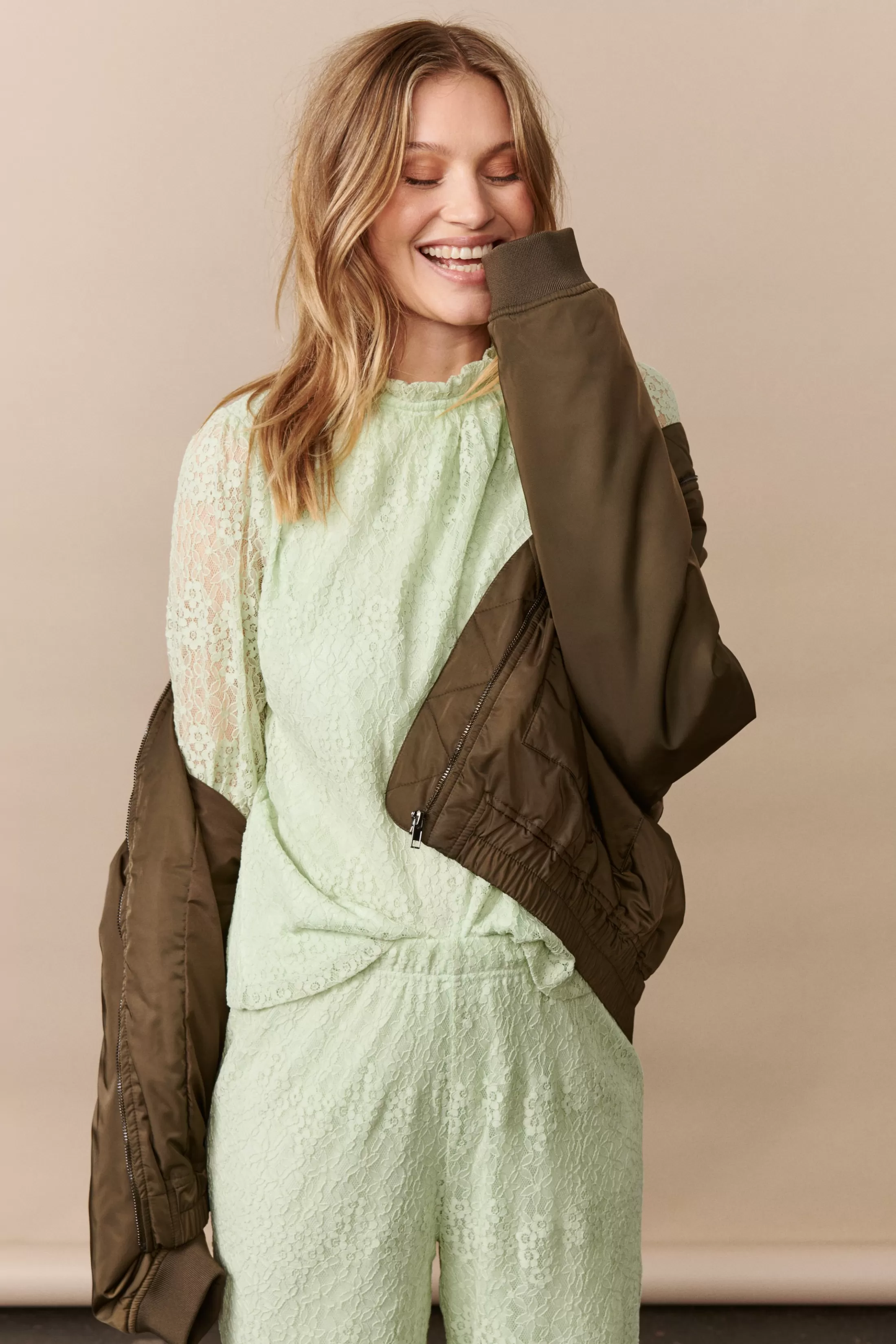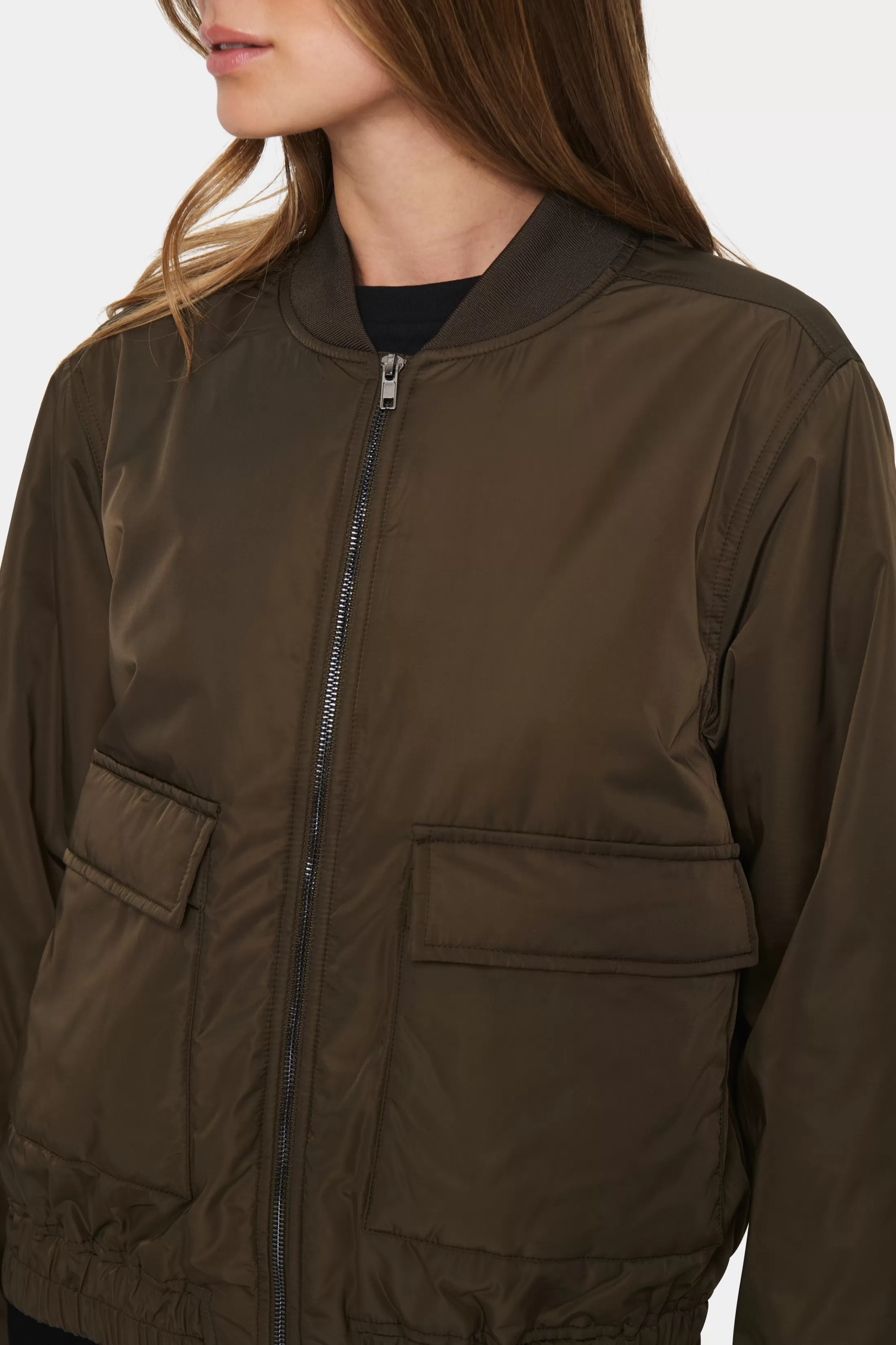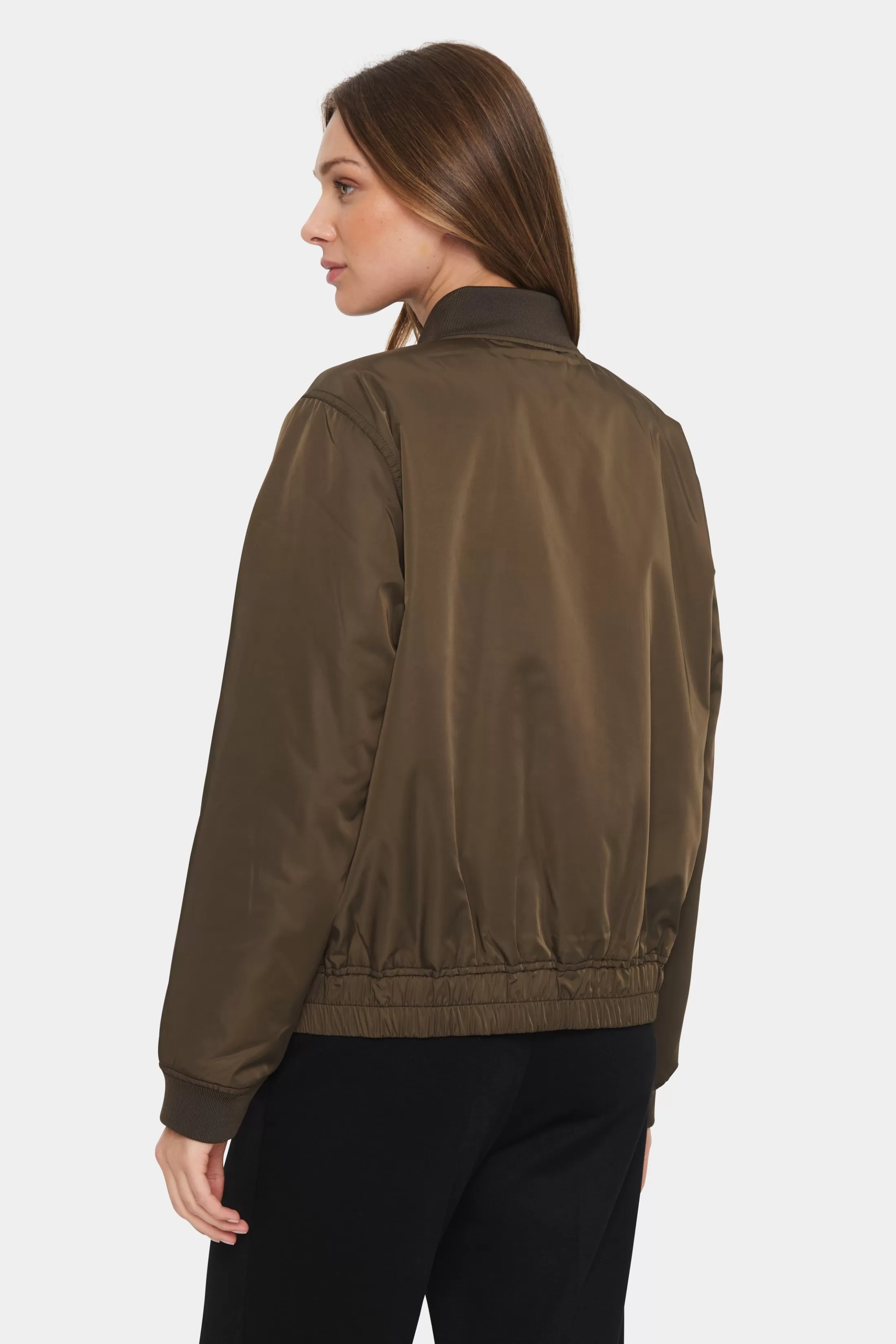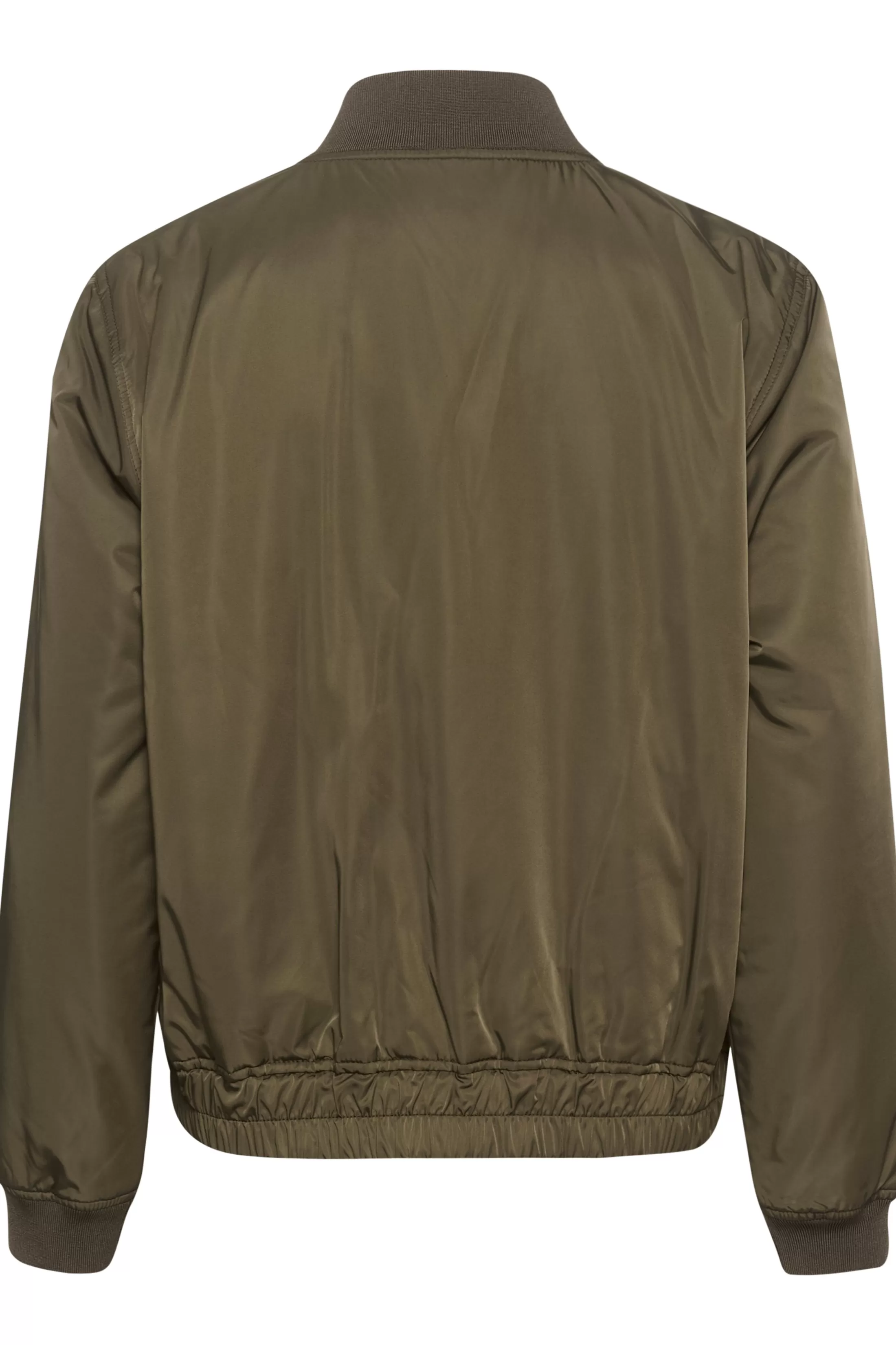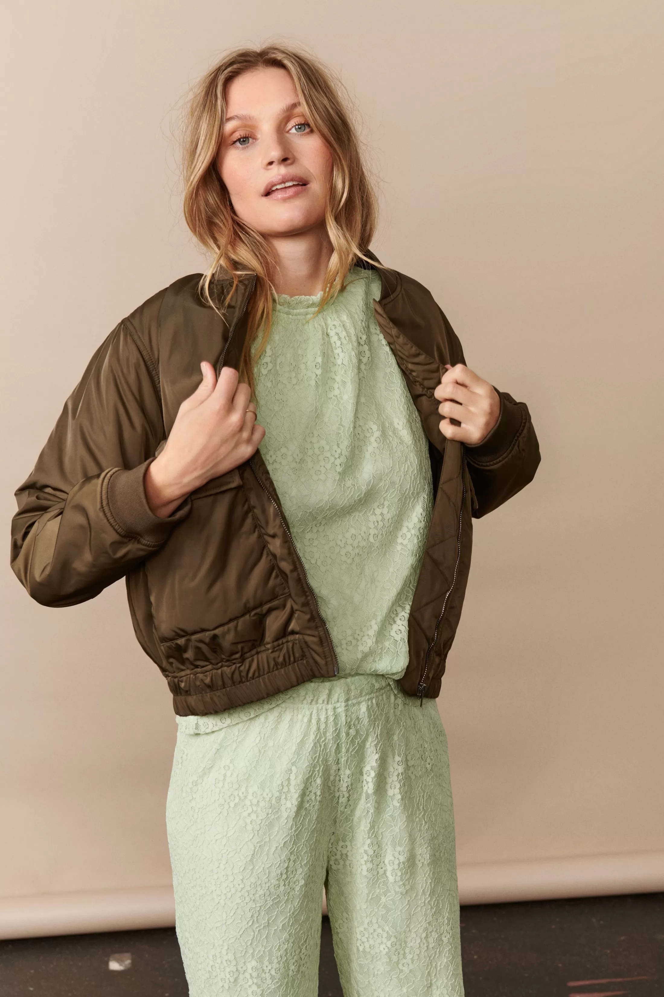 Olivengrøn bomberjakke med lange ærmer med ribkanter, elastik ved kanten forneden samt lyslåslukningen. nModellen er 176 cm høj og iført størrelse M