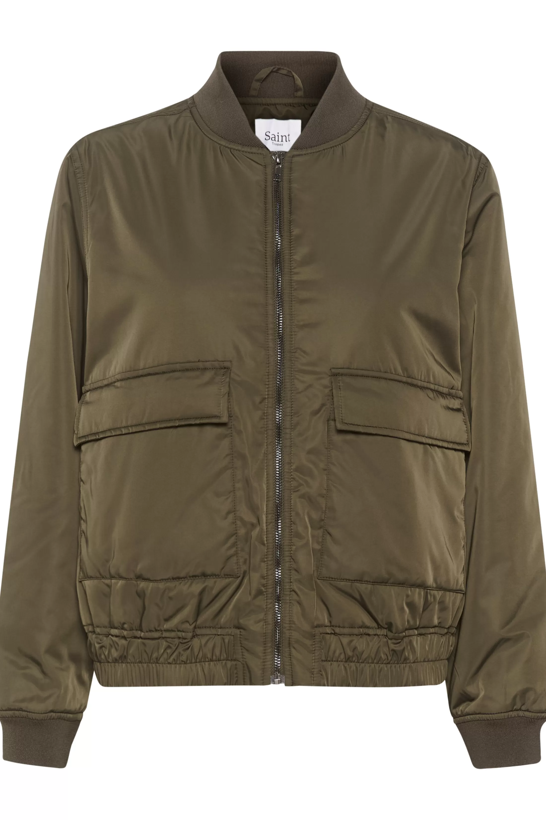 Olivengrøn bomberjakke med lange ærmer med ribkanter, elastik ved kanten forneden samt lyslåslukningen. nModellen er…