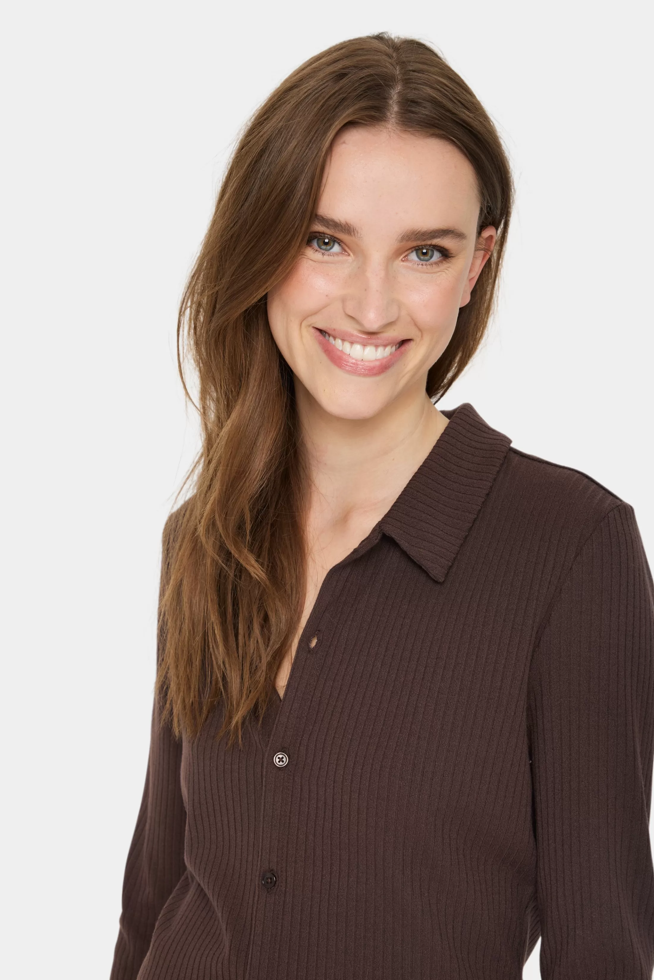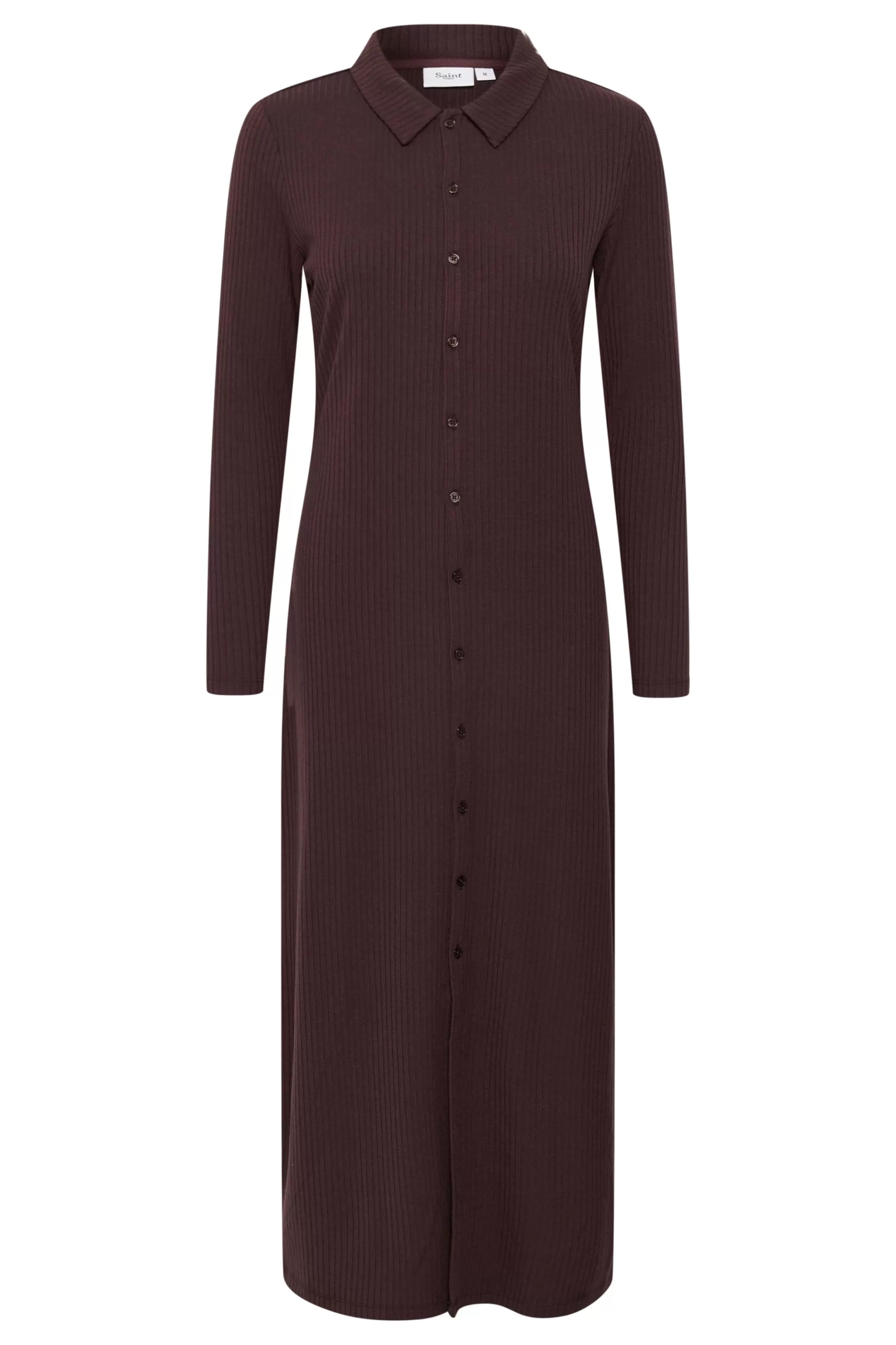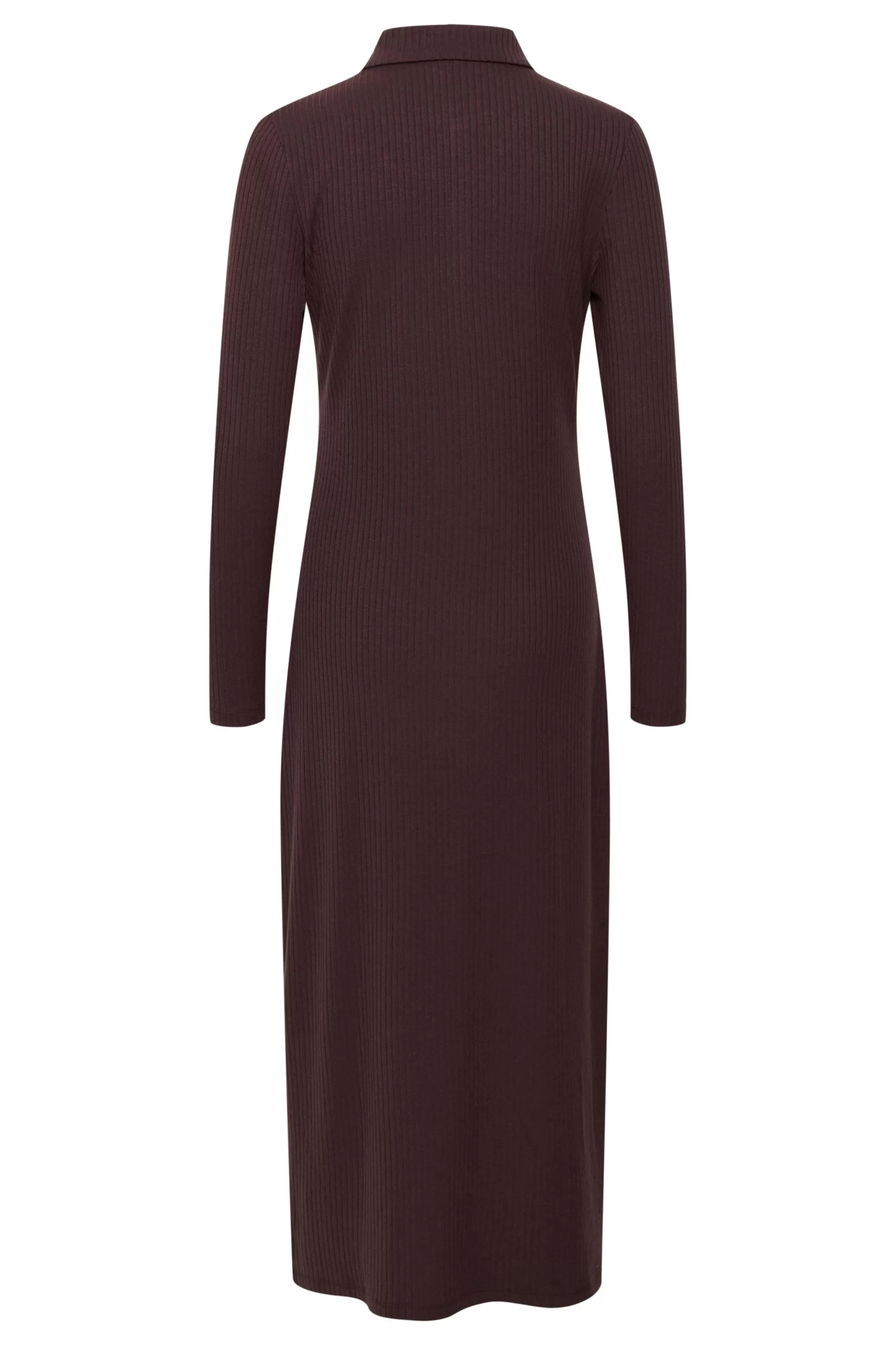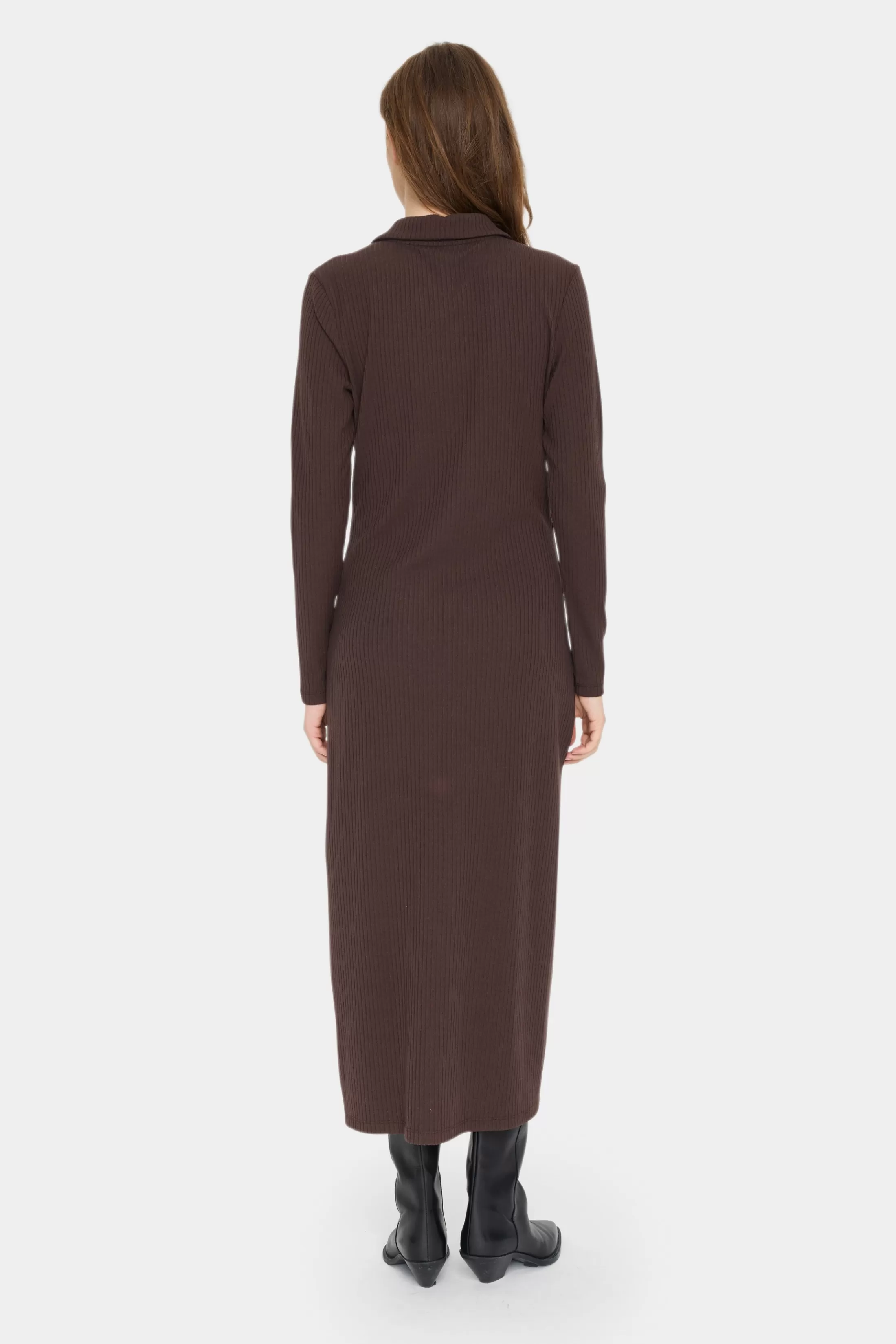 Denne mørkebrune, ribstrikkede maxikjole har en tidløs skjortekrave og knaplukning hele vejen ned. Med sin tætsiddende pasform og lange ærmer er den perfekt til både hverdagsbrug og mere formelle anledninger. nnModellen er 176 cm høj og er iført en str. M.