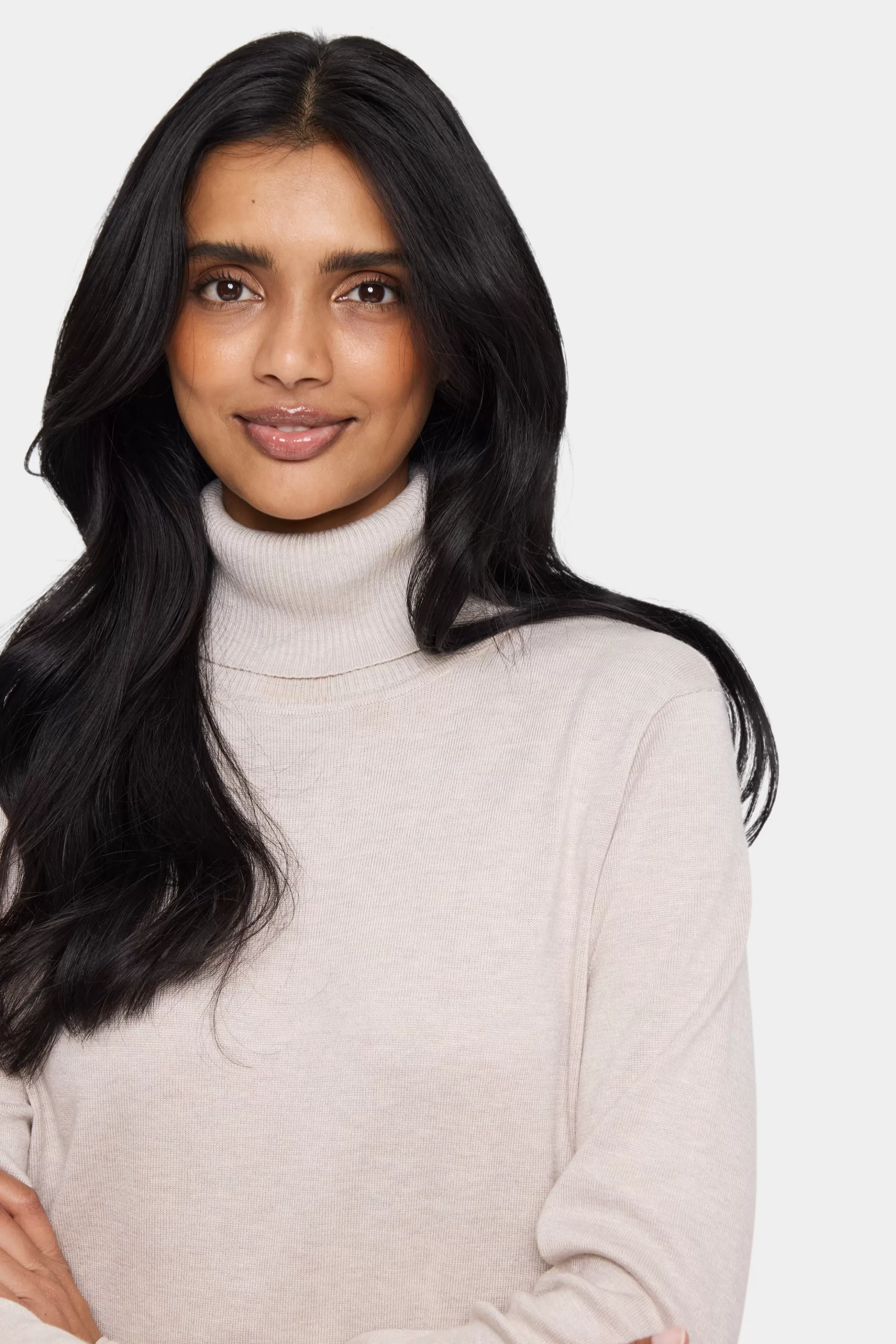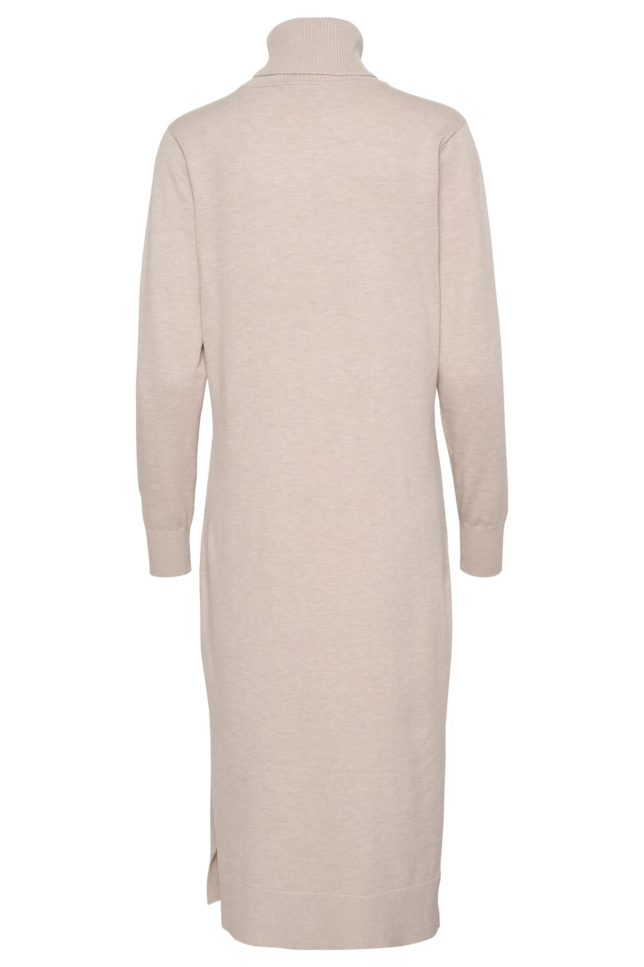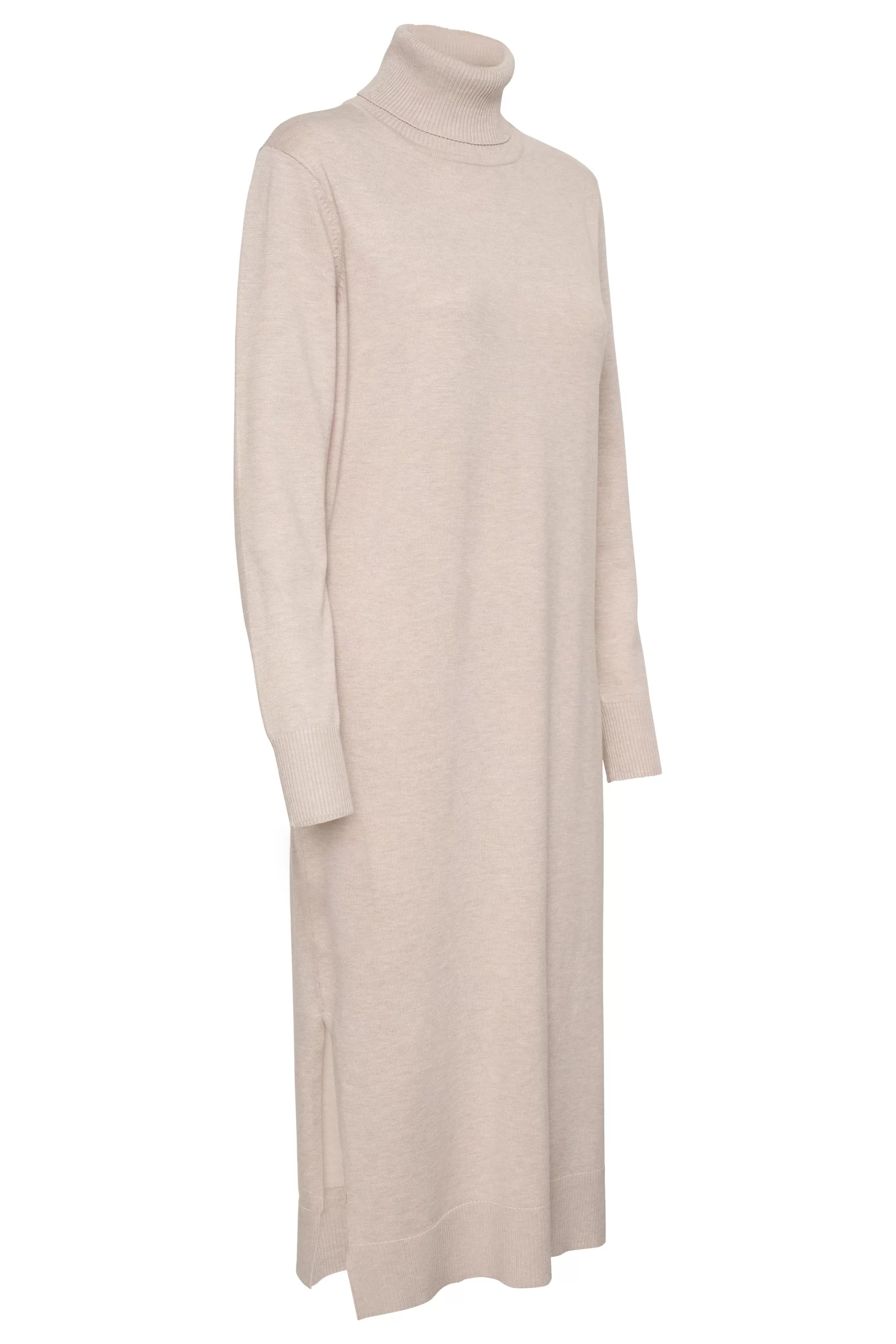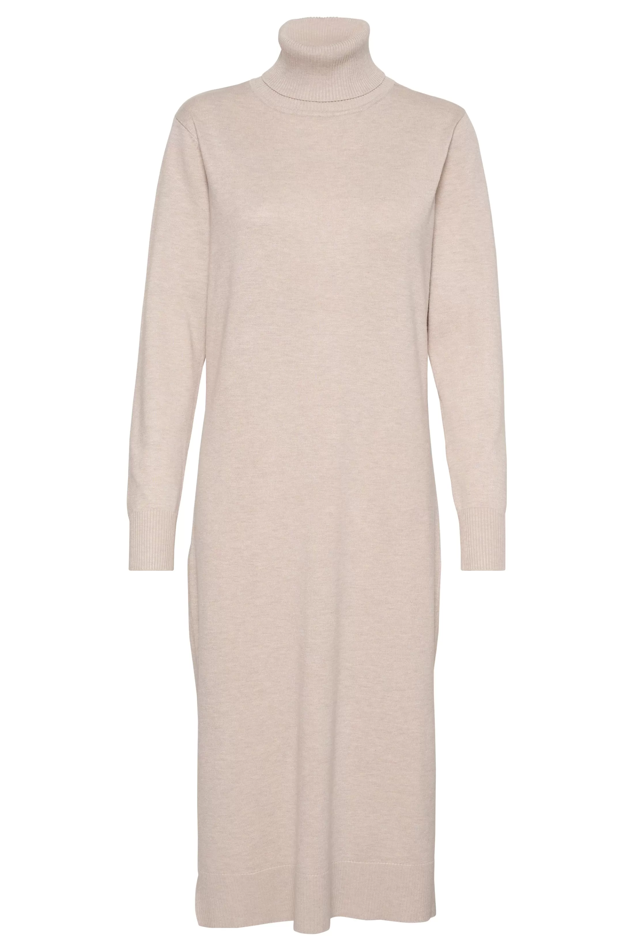 Denne strikkjole har en klassisk rullekrave, ribmanchetter og en slids i siden for ekstra bevægelse og stil. Den giver varme og komfort med en smigrende pasform, hvilket gør den alsidig til både afslappede og finere anledninger.nnModellen er iført en str. M.