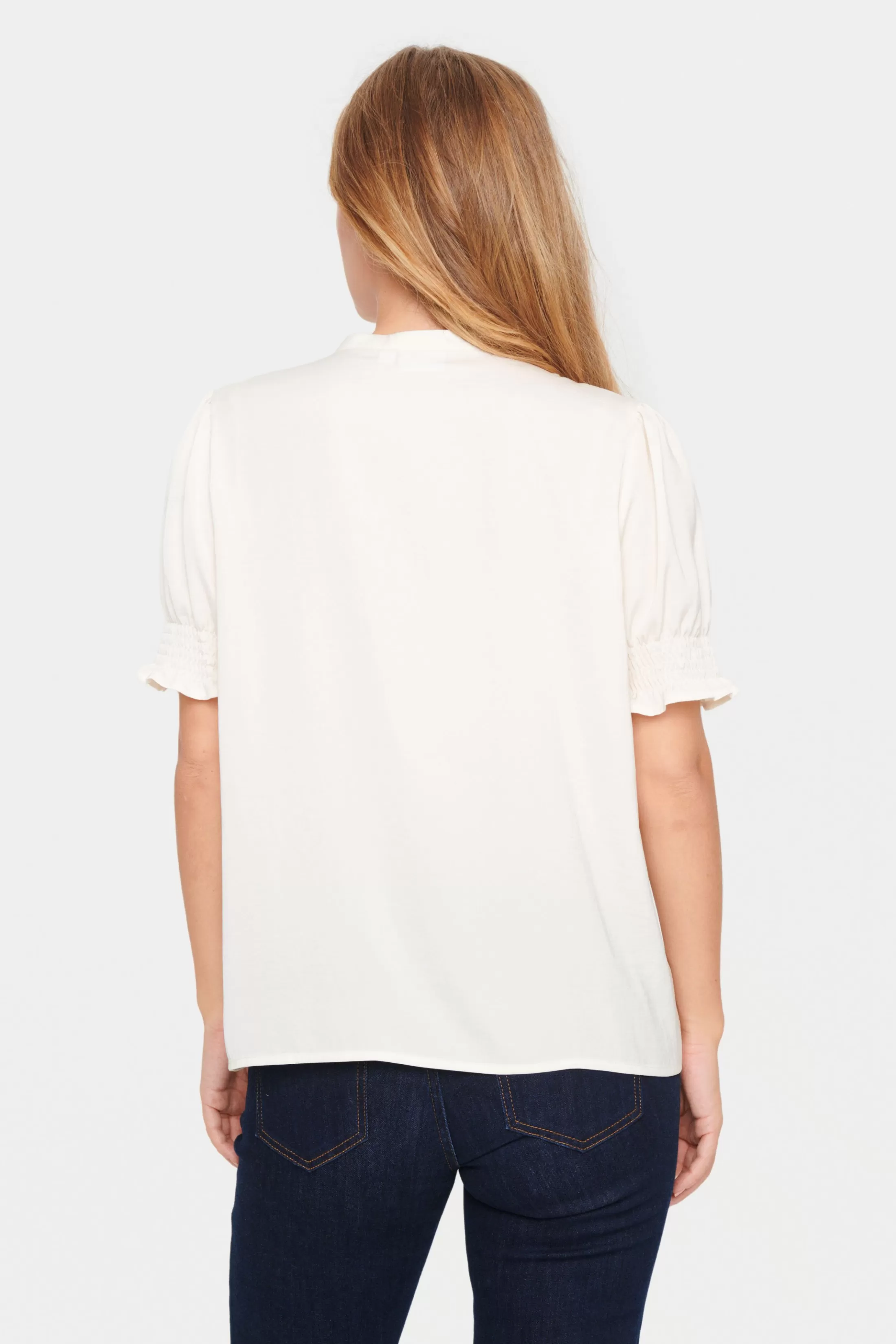 Kortærmet skjorte med kinakrave, elastikdetajle på ærmerne samt slids ved brystet med knaplukning. nnModellen er 179 cm høj og er iført en størrelse M.