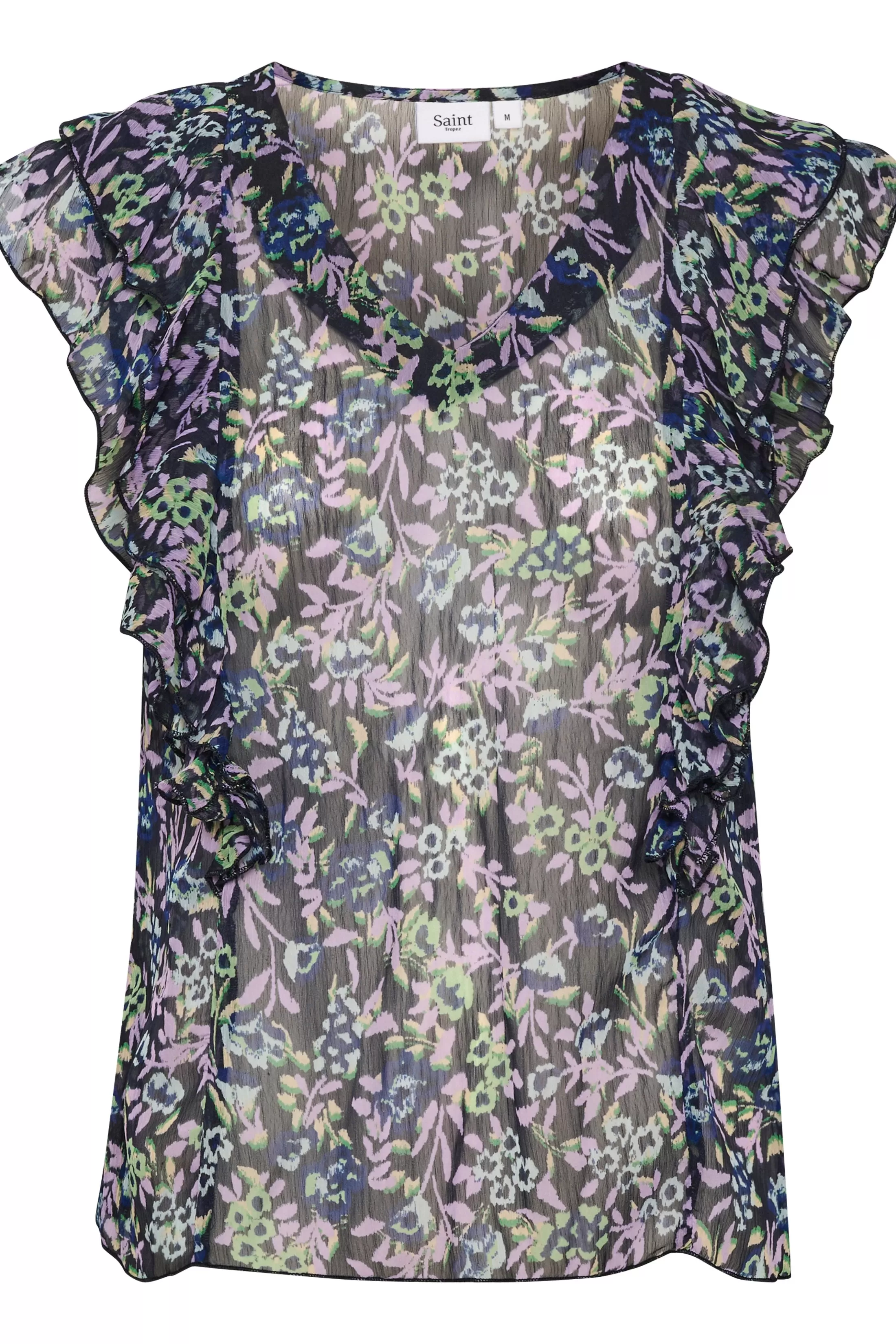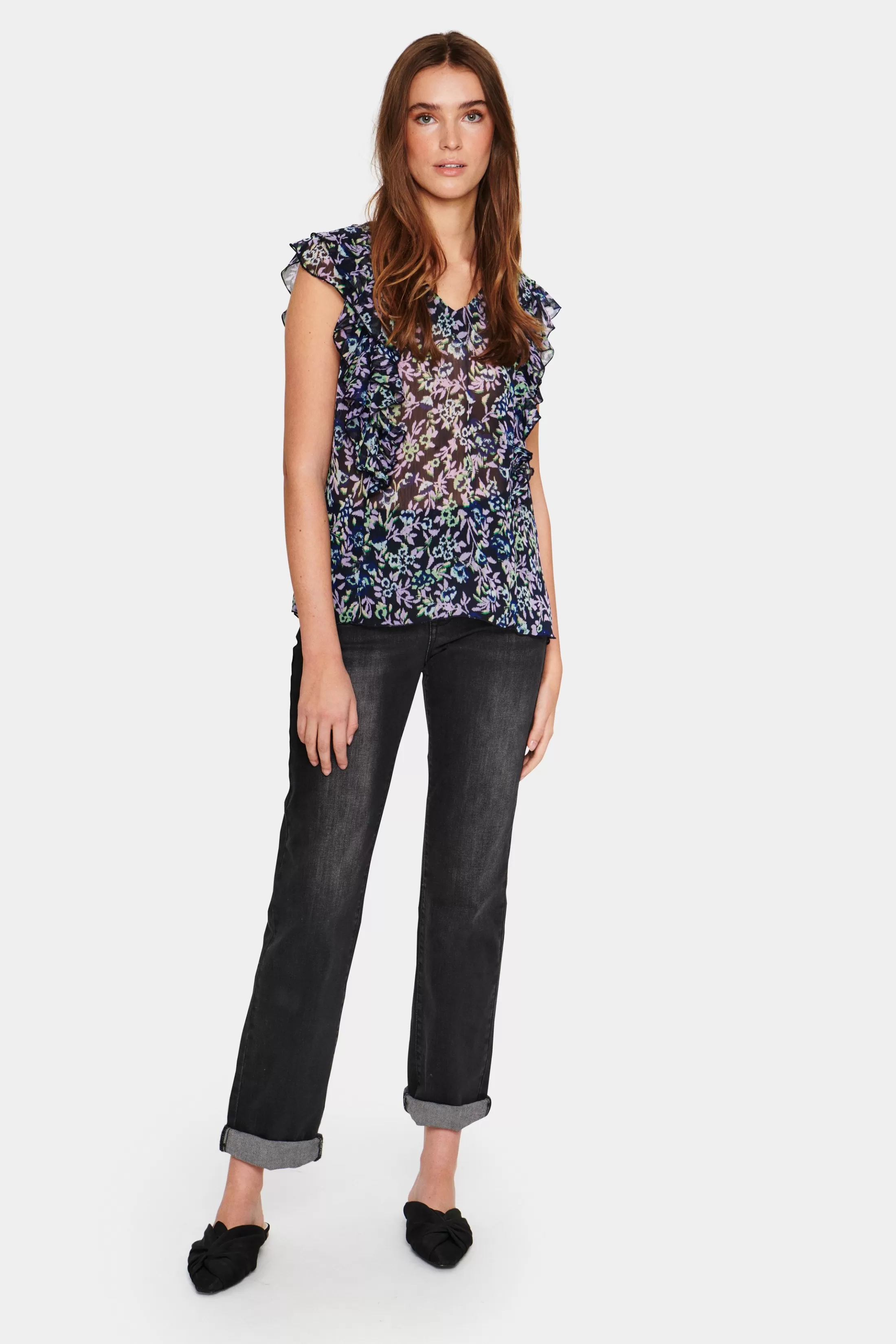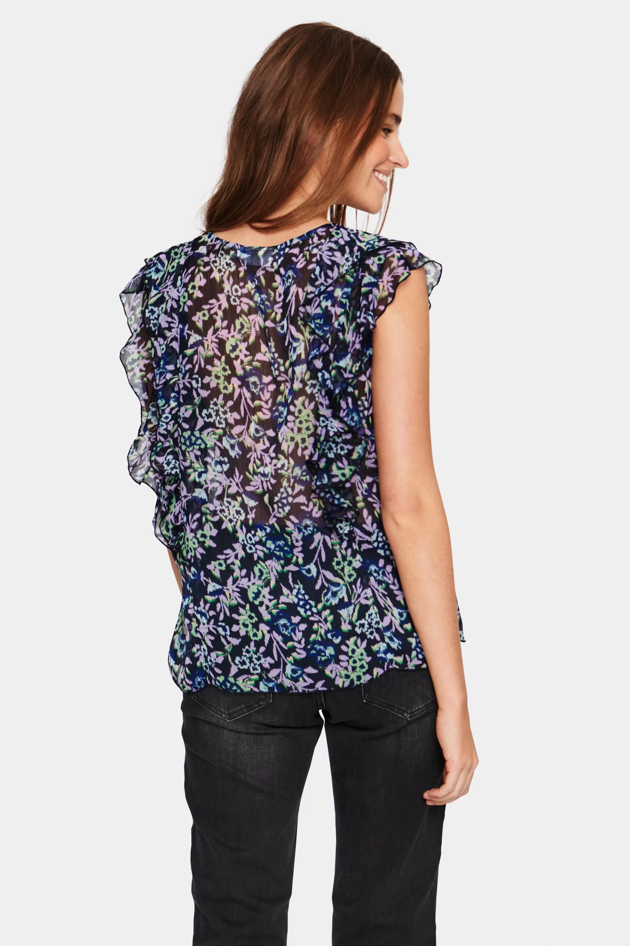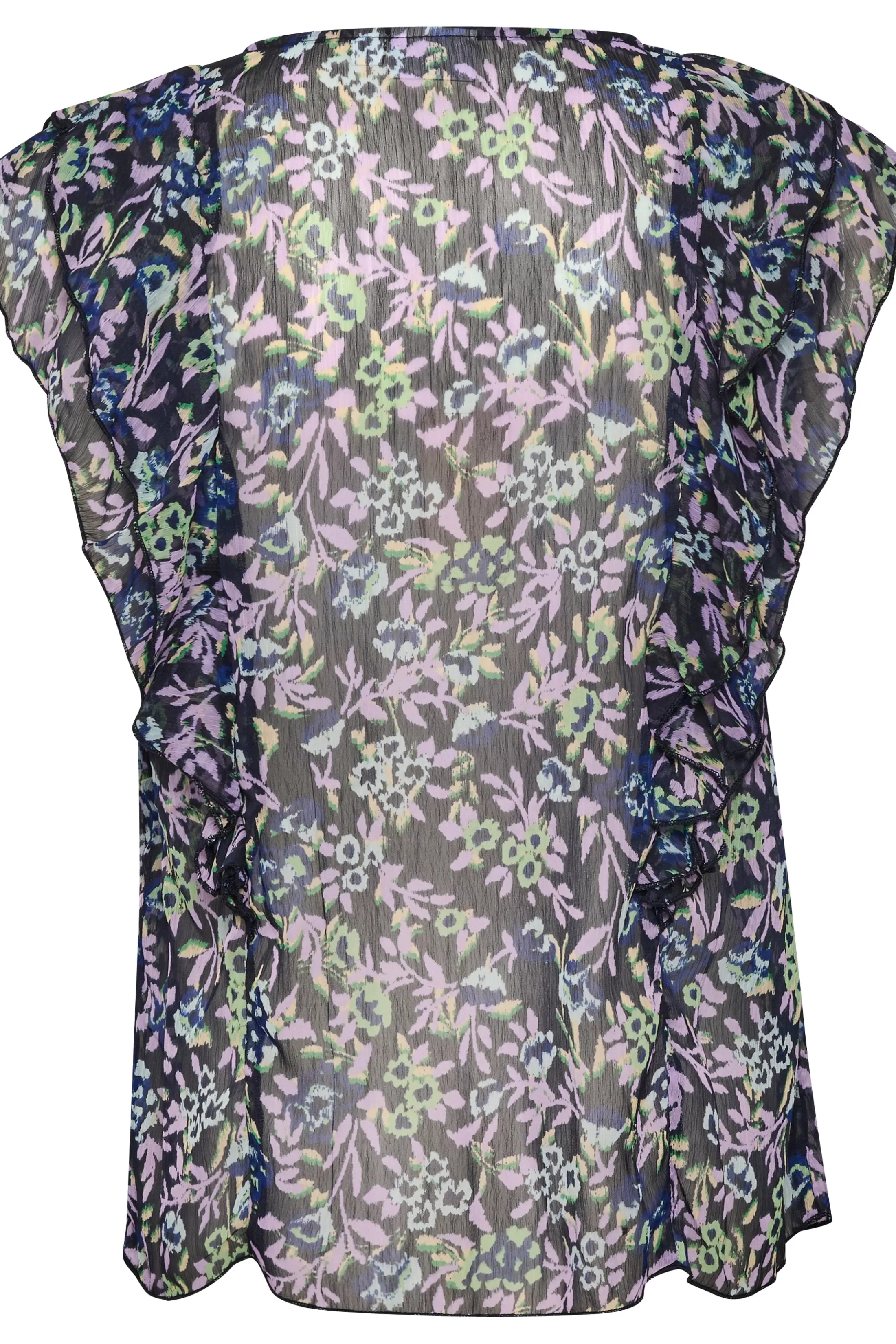 Transparent blomstret top med V-udskæring samt korte ærmer med frynsedetaljer. Toppen har en normal pasform og er i vævet kvalitet. nnClara er 177 cm og er iført en str. M.