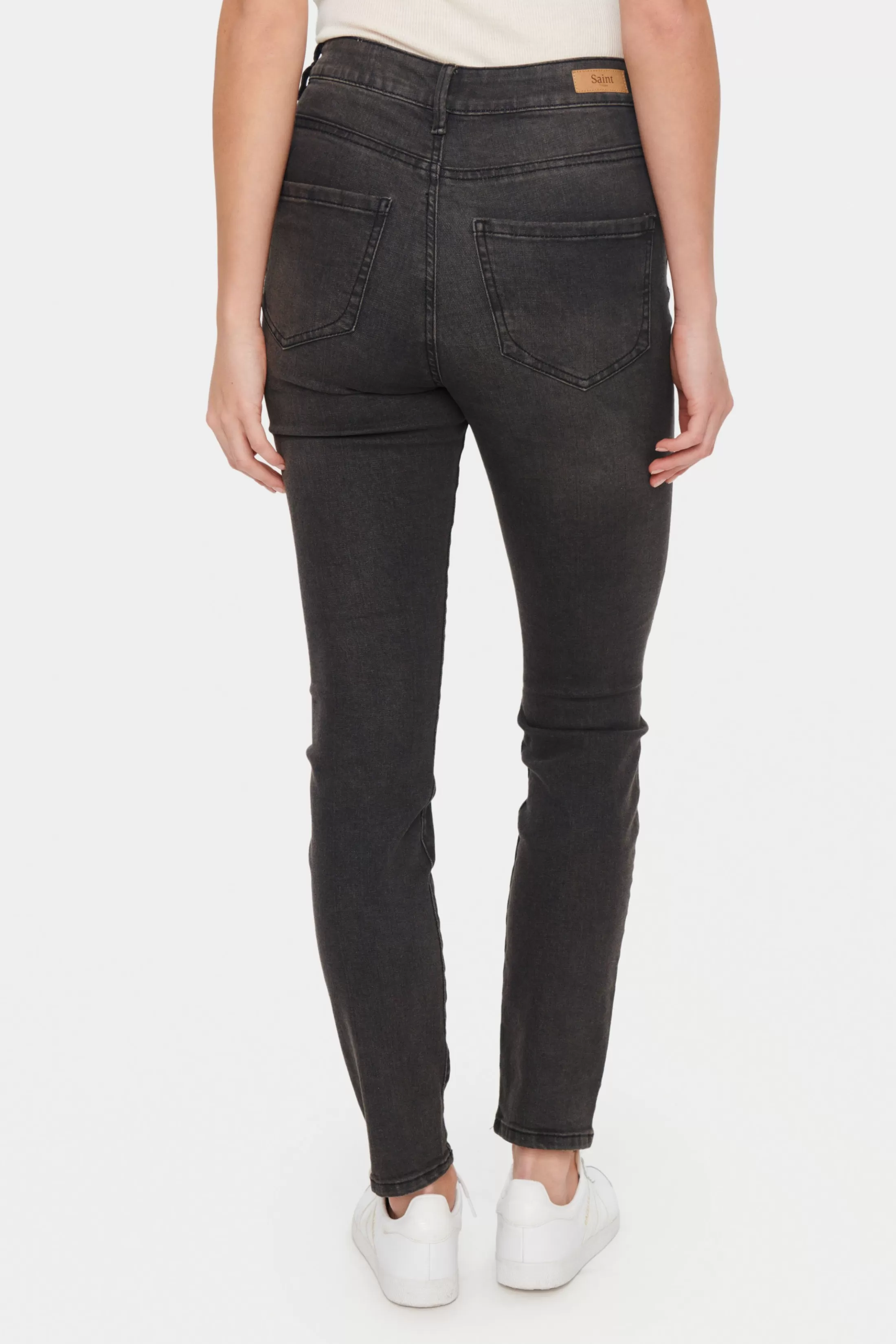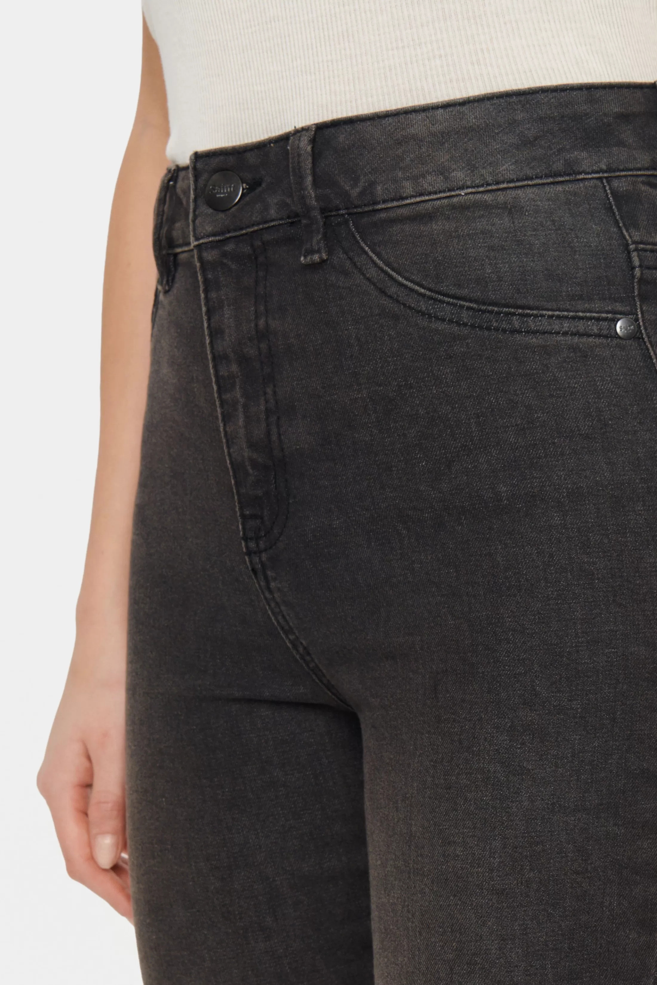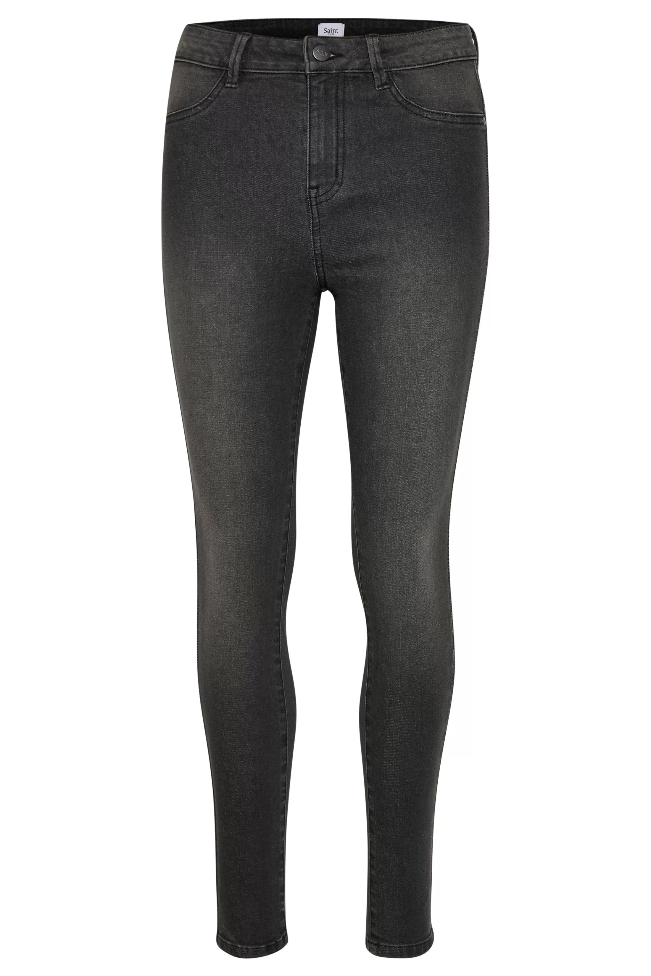 Denimbuks med fast linning, bæltestropper samt knap og lynlåslukning. Buksen har 2 snydelommer foran, samt 2 lommer bagpå, en tætsiddende pasform samt en høj talje.