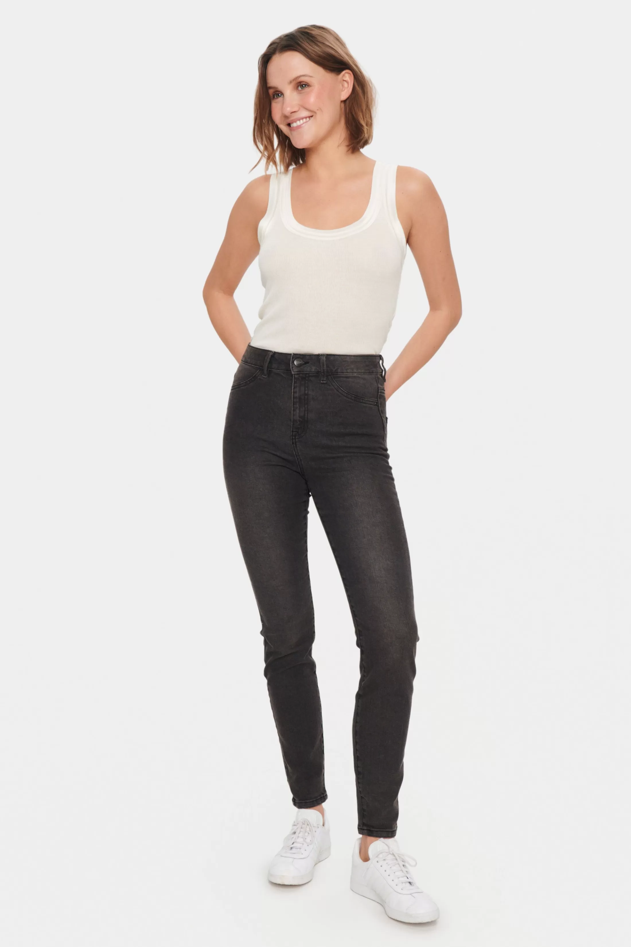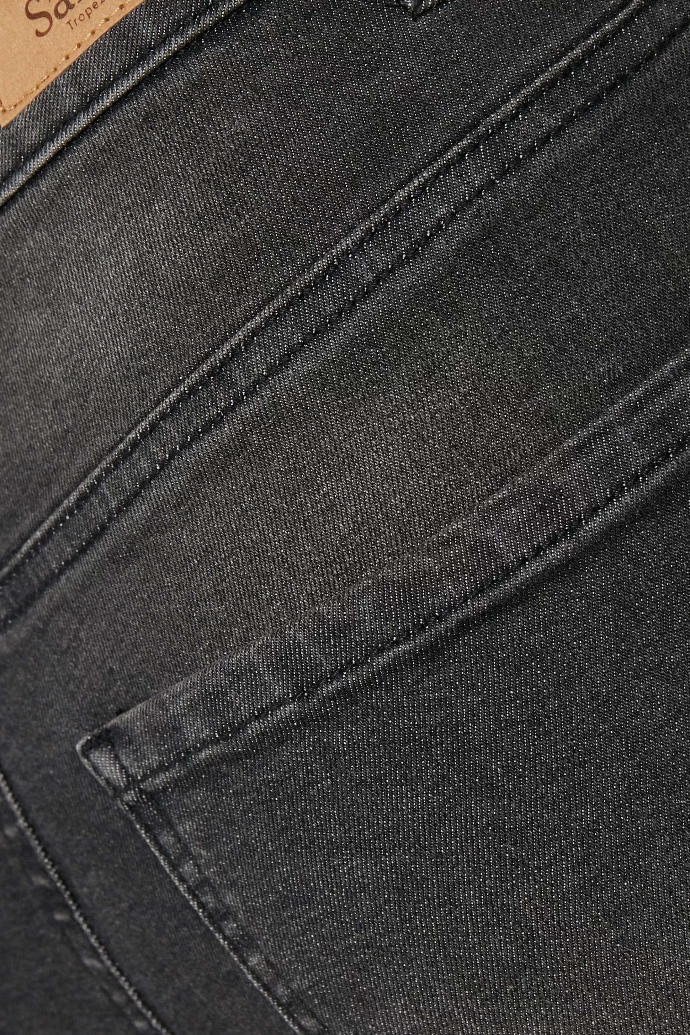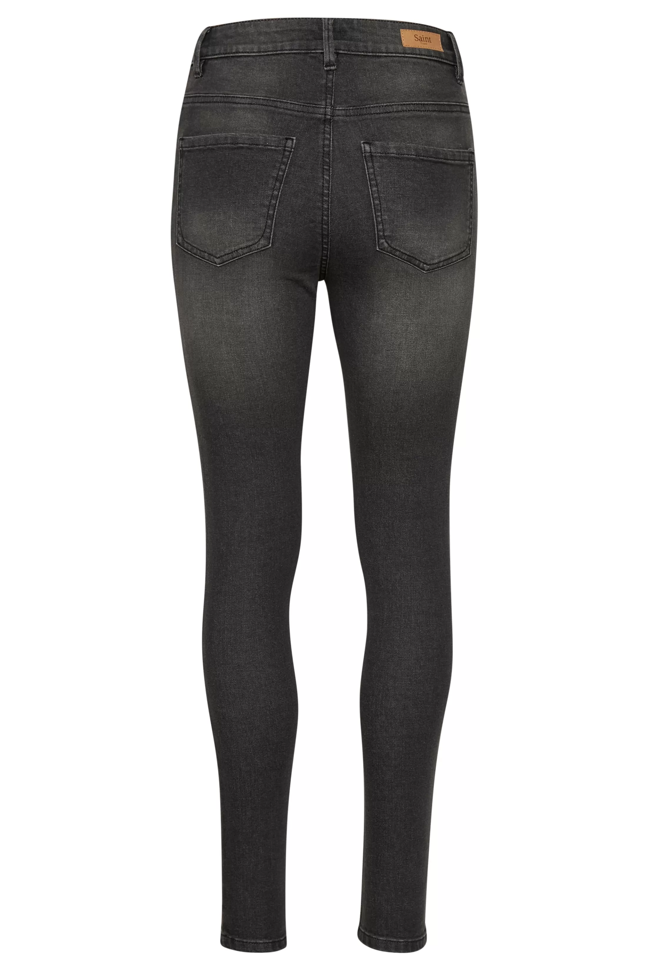Denimbuks med fast linning, bæltestropper samt knap og lynlåslukning. Buksen har 2 snydelommer foran, samt 2 lommer bagpå, en tætsiddende pasform samt en høj talje.