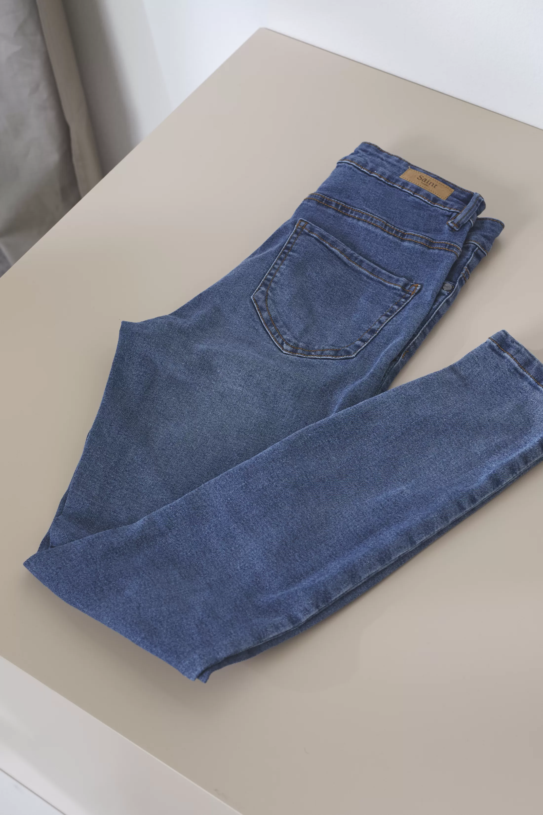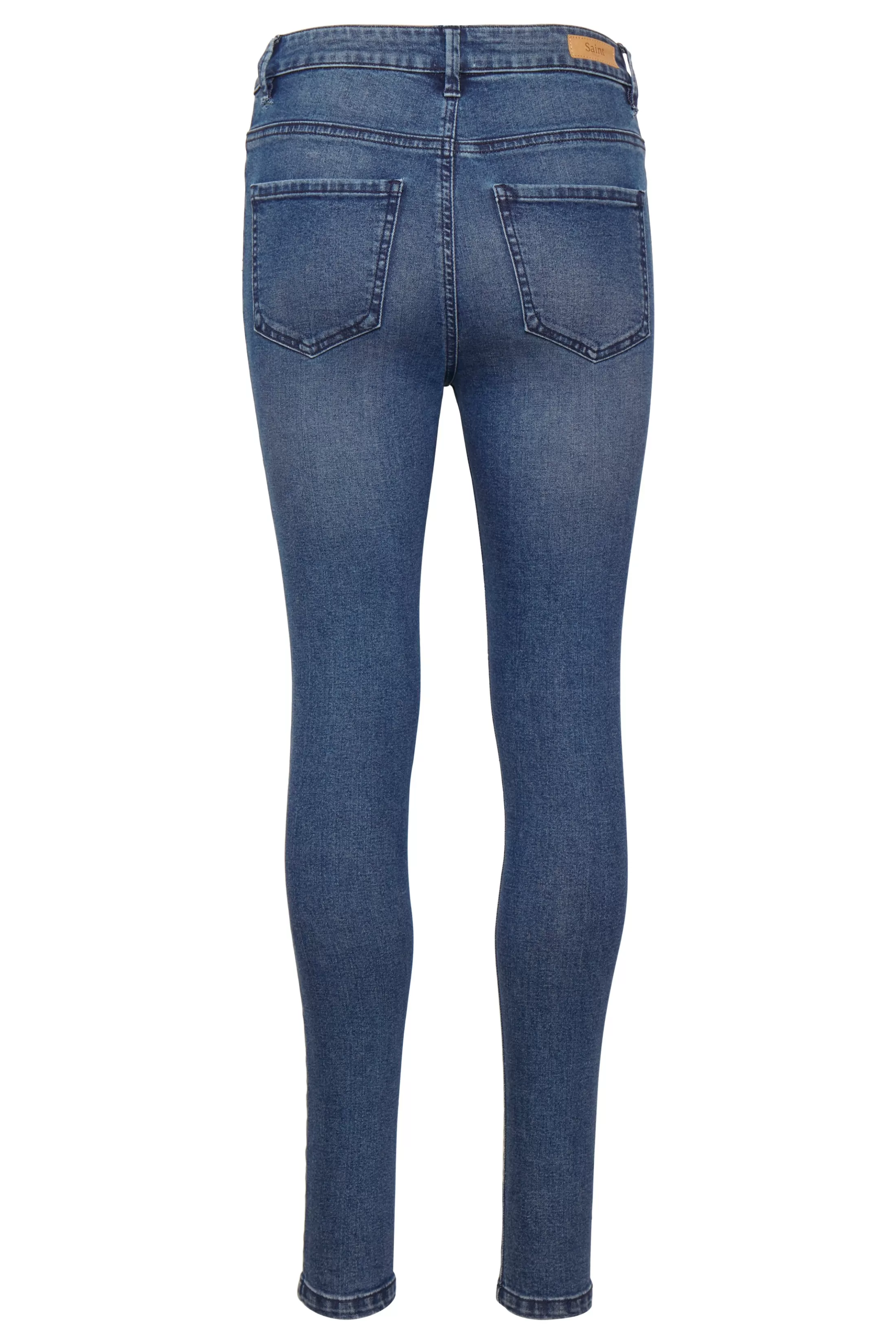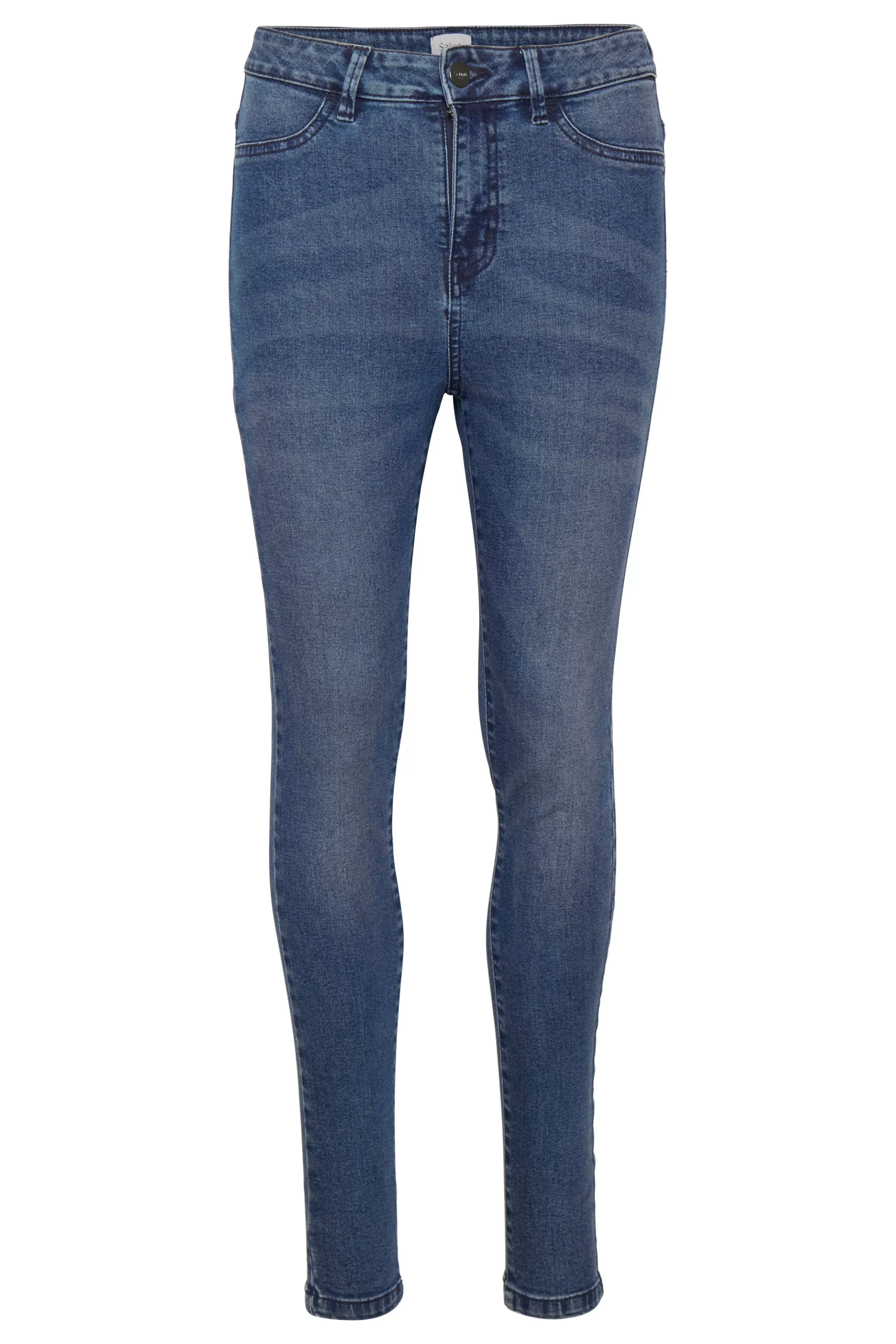 Denimbuks med fast linning, bæltestropper samt knap og lynlåslukning. Buksen har 2 snydelommer foran, samt 2 lommer bagpå, en tætsiddende pasform samt en høj talje.