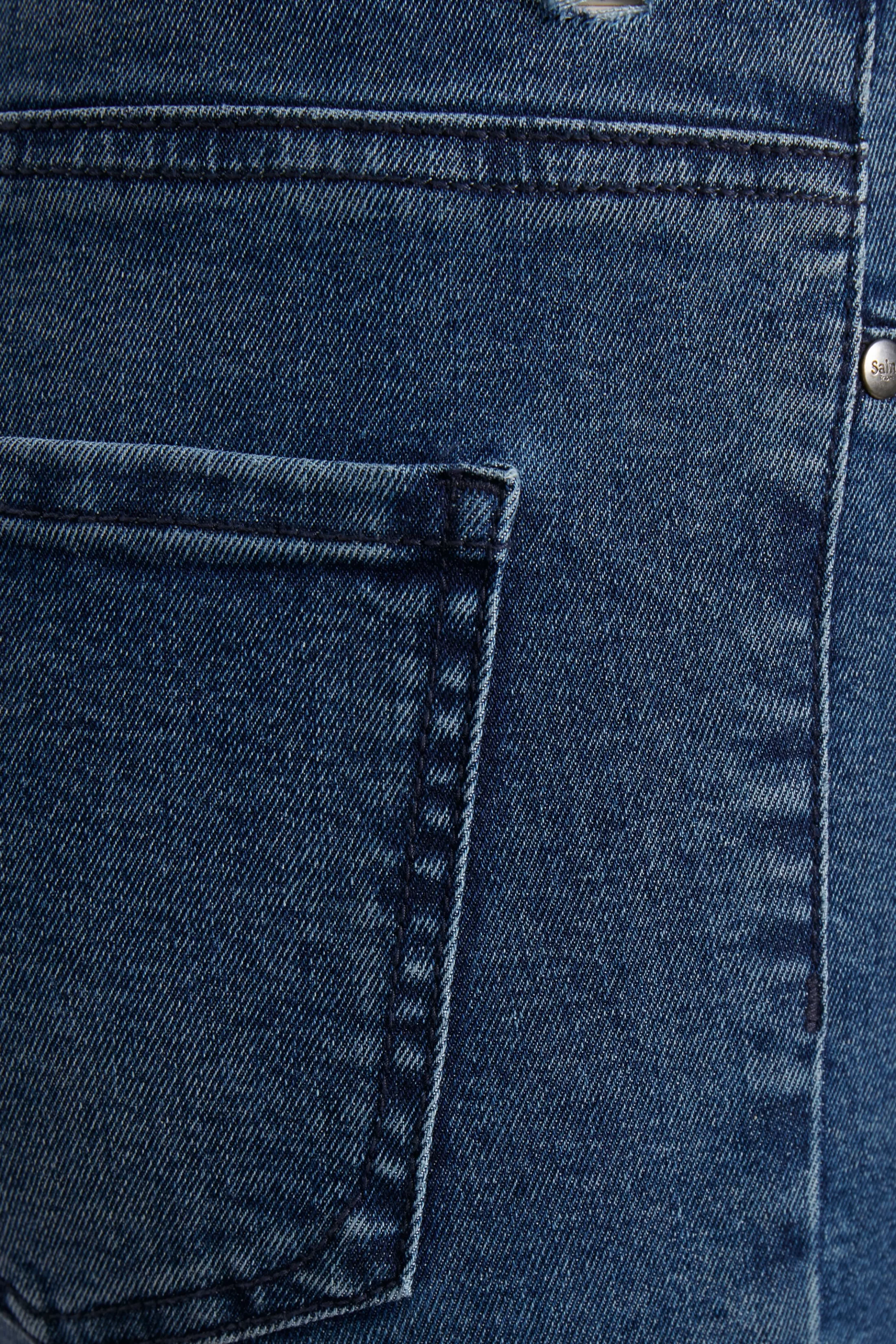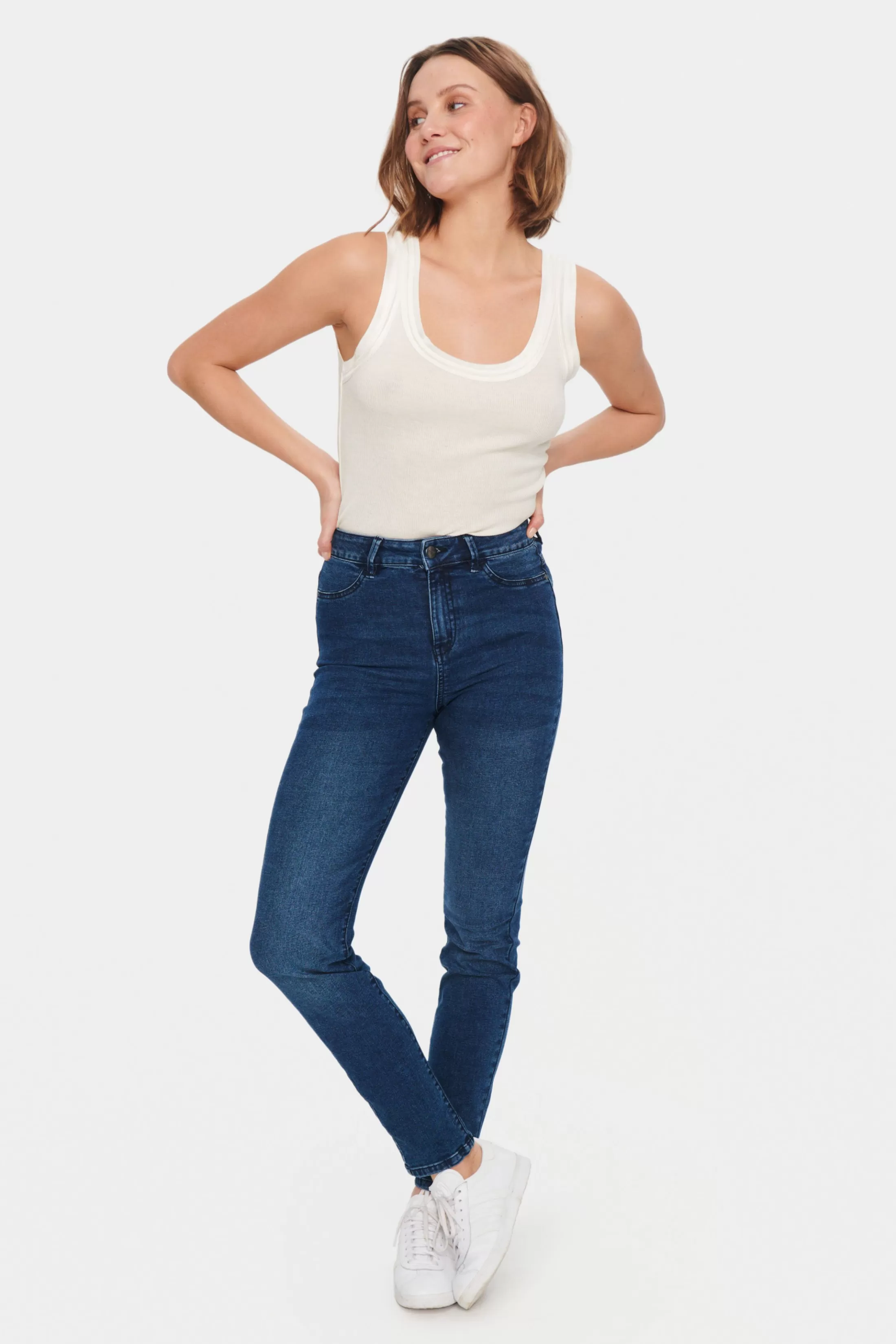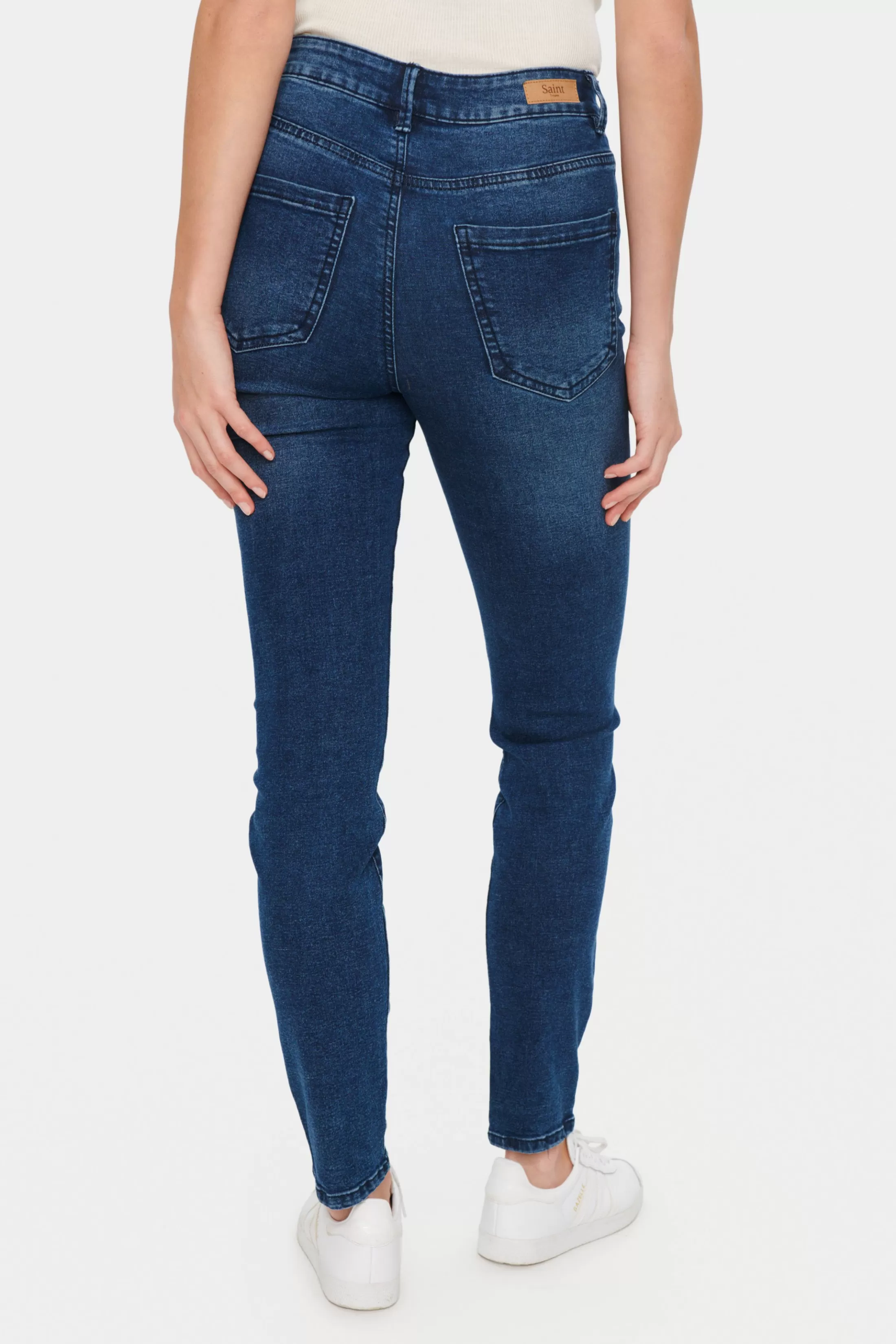 Denimbuks med fast linning, bæltestropper samt knap og lynlåslukning. Buksen har 2 snydelommer foran, samt 2 lommer bagpå, en tætsiddende pasform samt en høj talje.