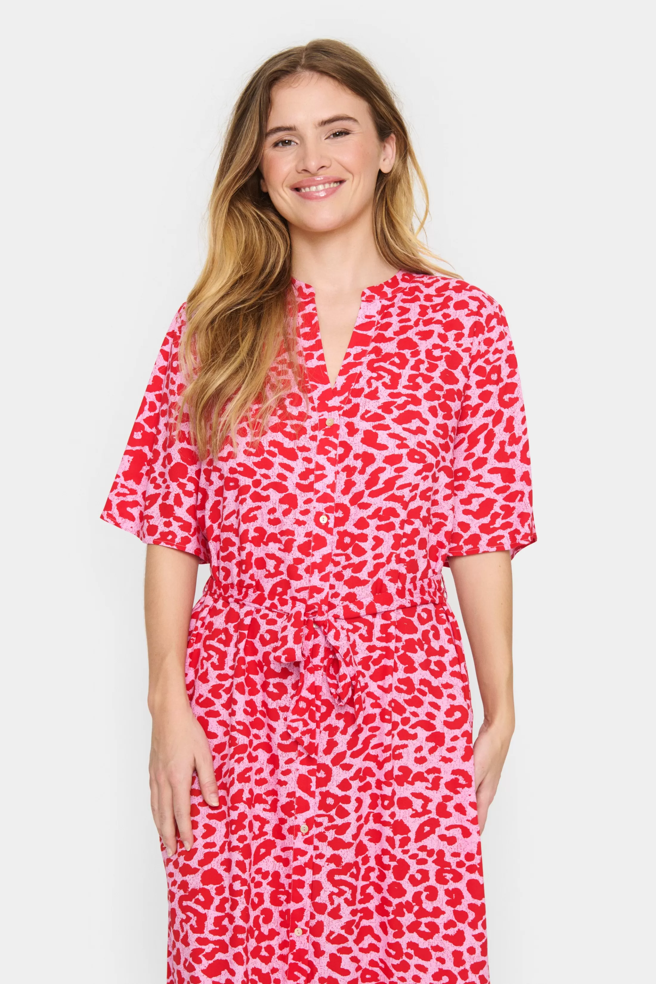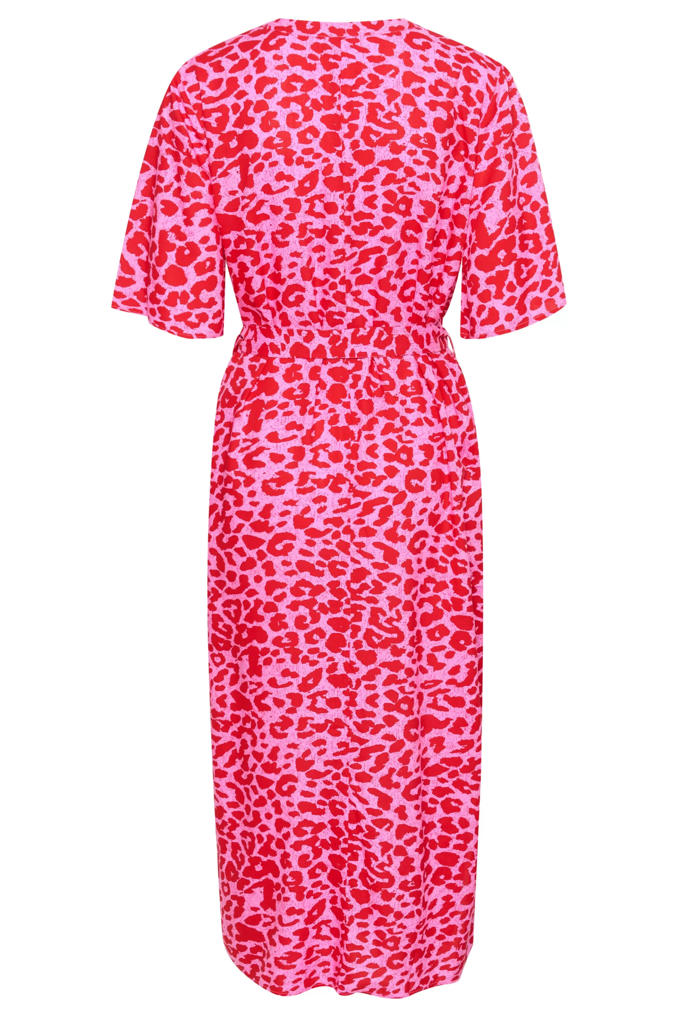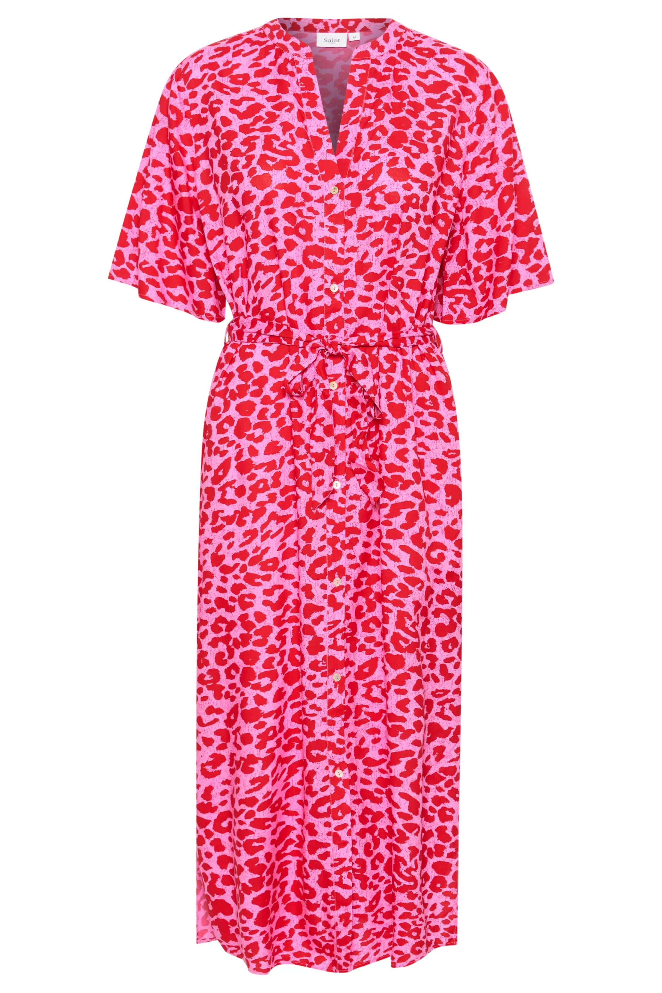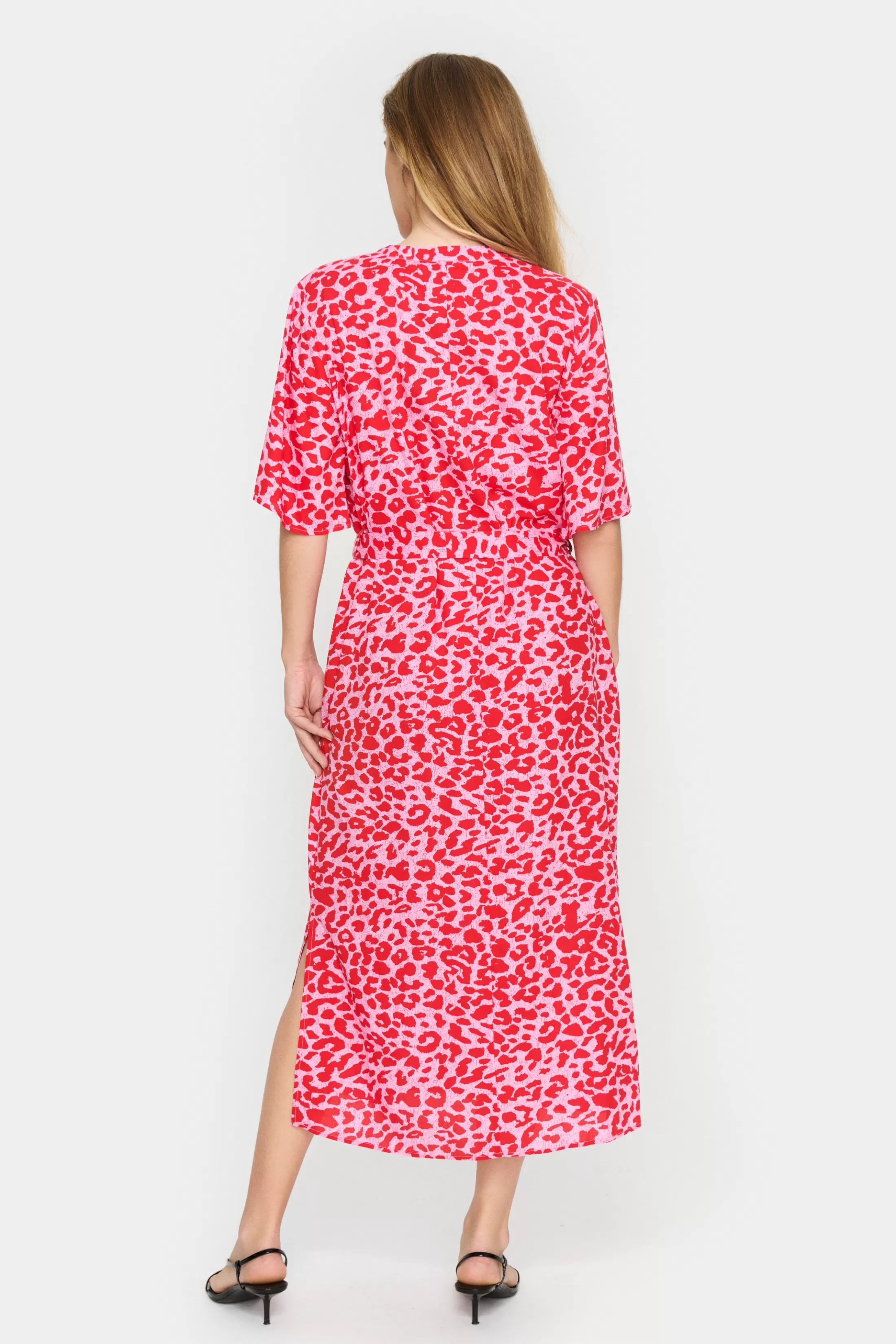 Maxi kjole i leopard print, mend knaplukning, korte ærmer samt bindebånd i tajlen.nnModellen er 177 cm høj og er iført en str. M.