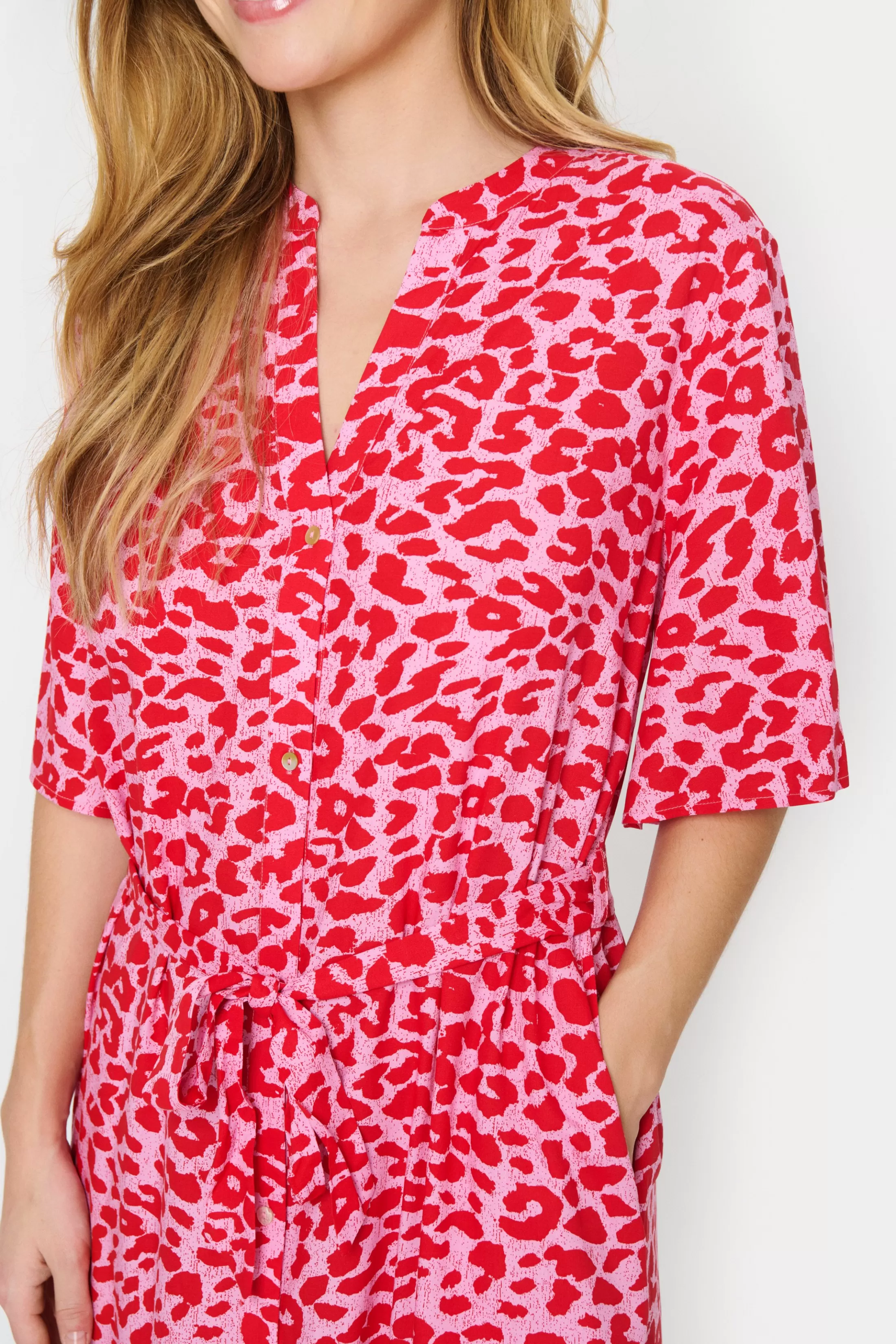 Maxi kjole i leopard print, mend knaplukning, korte ærmer samt bindebånd i tajlen.nnModellen er 177 cm høj og er if…